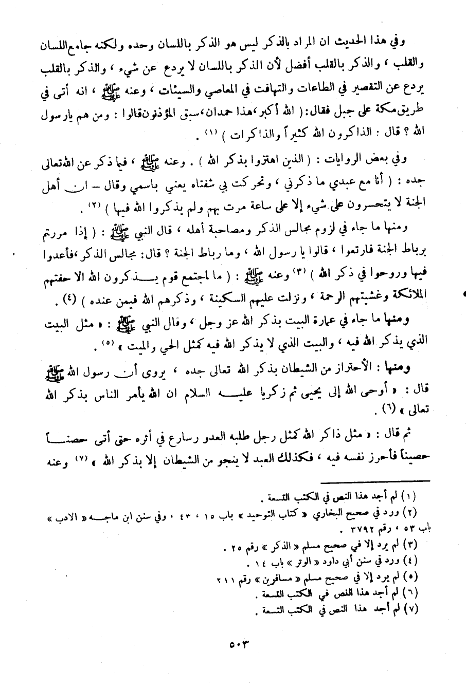 وفي هذا الحديث أن المراد بالذكر ليس هو الذكر باللسان وحده ولكنه جامع اللسان والقلب، والذكر بالقلب أفضل لأن الذكر باللسان لا يردع عن شيء، والذكر بالقلب يردع عن التقصير في الطاعات والتهافت في المعاصي والسيئات، وعنه صلى الله عليه وسلم، أنه أتى في طريق مكة على جبل فقال: "الله أكبر، هذا حمدان، سبق المؤذنون قالوا: ومن هم يا رسول الله؟ قال: الذاكرون الله كثيرا والذاكرات". وفي بعض الروايات: "الذين اهتزوا بذكر الله". وعنه صلى الله عليه وسلم، فيما ذكر عن الله تعالى جده: "أنا مع عبدي ما ذكرني، وتحركت بي شفتاه يعني باسمي وقال- إن أهل الجنة لا يتحسرون على شيء إلا على ساعة مرت بهم ولم يذكروا الله فيها".