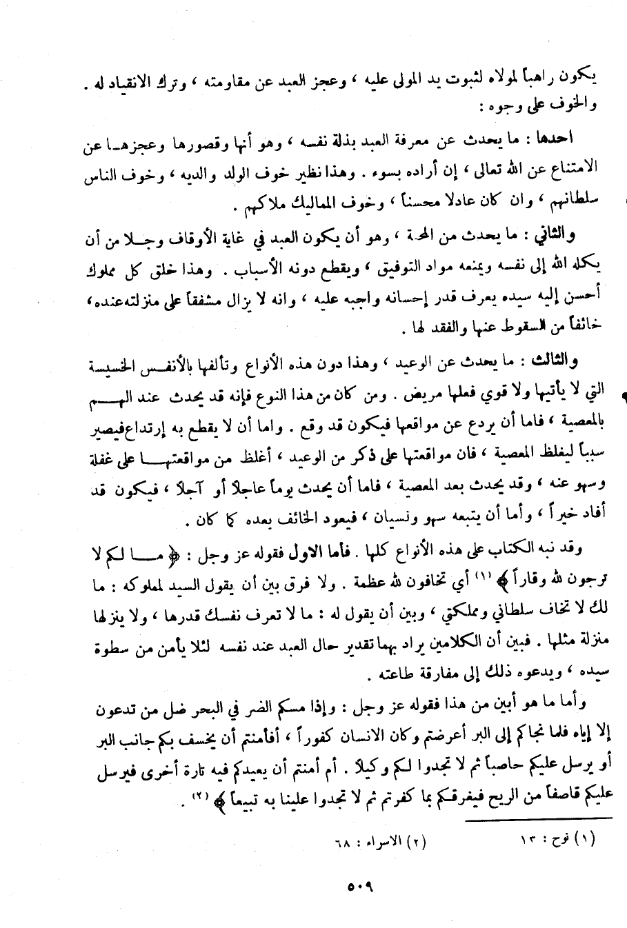 احدها: أما يحدث عن معرفة العبد بذلة نفسه، وهو أنها وقصورها وعجزها عن الامتناع عن الله تعالى، إن أراده بسوء. وهذا نظير خوف الولد والديه، وخوف الناس سلطانهم، وإن كان عادلا محسنا، وخوف المماليك ملاكهم.