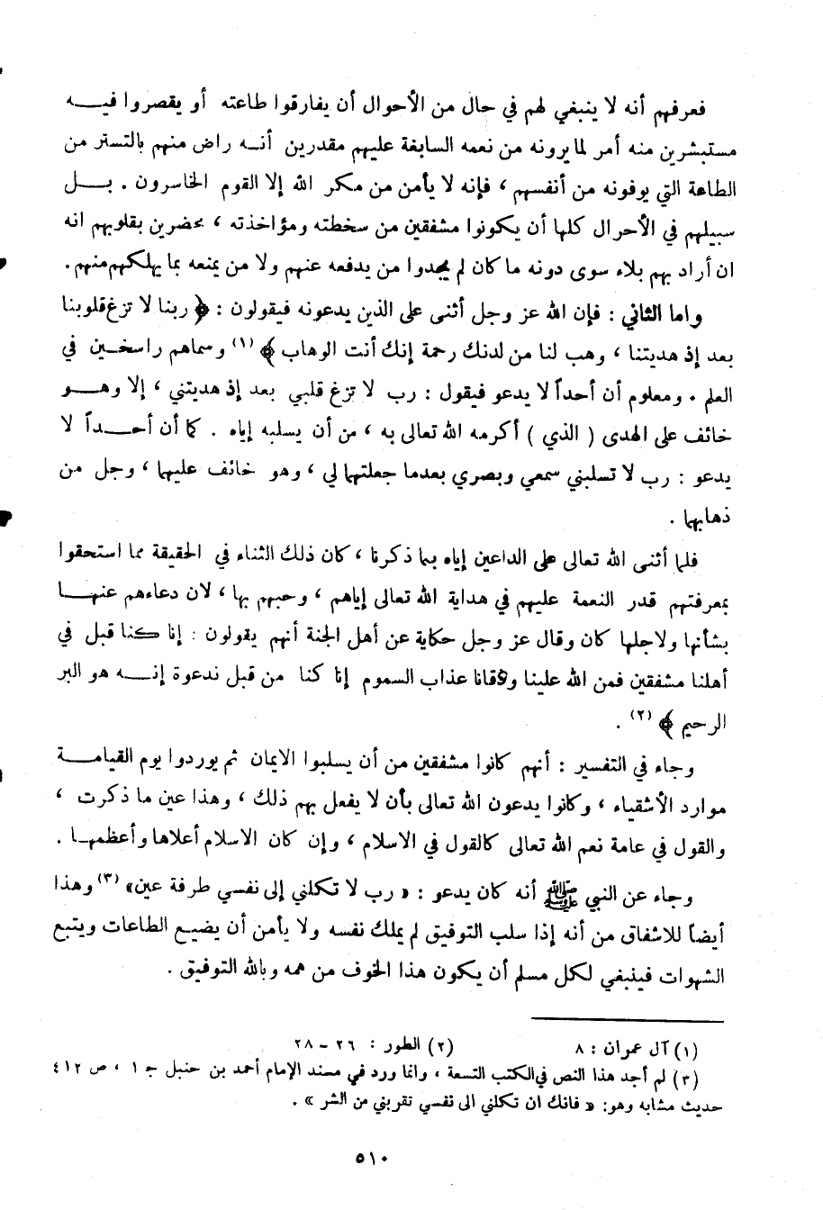 وأما الثاني: فإن الله عز وجل أثنى على الذين يدعونه فيقولون: {ربنا لا تزغ قلوبنا بعد إذ هديتنا، وهب لنا من لدنك رحمة إنك أنت الوهاب} وسماهم راسخين في العلم. ومعلوم أن أحدا لا يدعو فيقول: رب لا تزغ قلبي بعد إذ هديتني، إلا وهو خائف على الهدى (الذي) أكرمه الله تعالى به، من أن يسلبه إياه. كما أن أحدا لا يدعو: رب لا تسلبني سمعي وبصري بعدما جعلتهما لي، وهو خائف عليهما، وجل من ذهابهما.