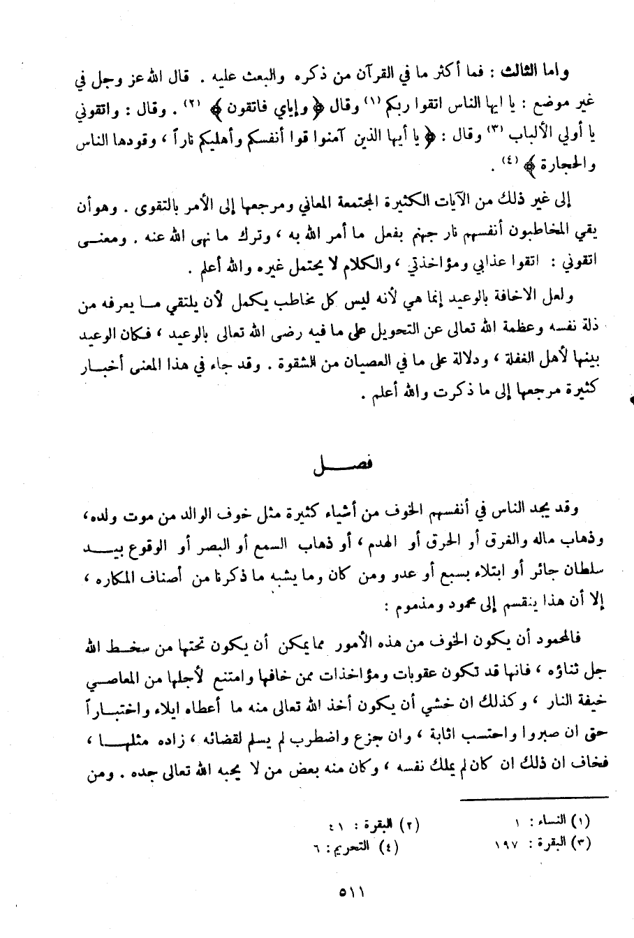 وأما الثالث: فما أكثر ما في القرآن من ذكره والبعث عليه. قال الله عز وجل في غير موضع: يا أيها الناس اتقوا ربكم وقال {وإياي فاتقون}. وقال: واتقوني يا أولي الألباب وقال: {يا أيها الذين آمنوا قوا أنفسكم وأهليكم نارا، وقودها الناس والحجارة}.
