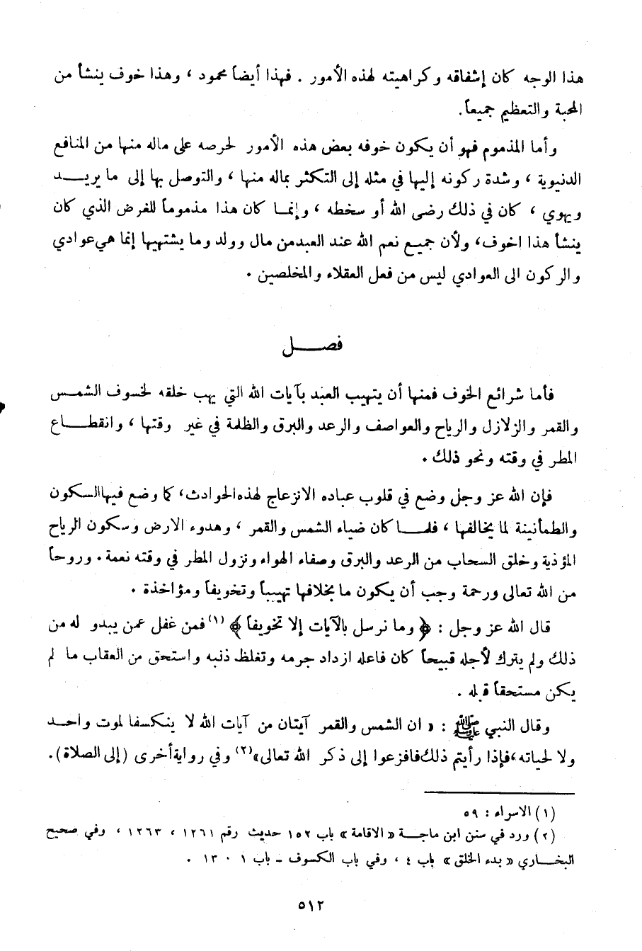 فإن الله عز وجل وضع في قلوب عباده الانزعاج لهذه الحوادث، كما وضع فيها السكون والطمأنينة لما يخالفها، فلما كان ضياء الشمس والقمر، وهدوء الأرض وسكون الرياح المؤذية وخلق الحساب من الرعد والبرق وصفاء الهواء ونزول المطر في وقته نعمة. وروحا من الله تعالى ورحمة وجب أن يكون ما بخلافها تهيبا وتخويفا ومؤاخذة.