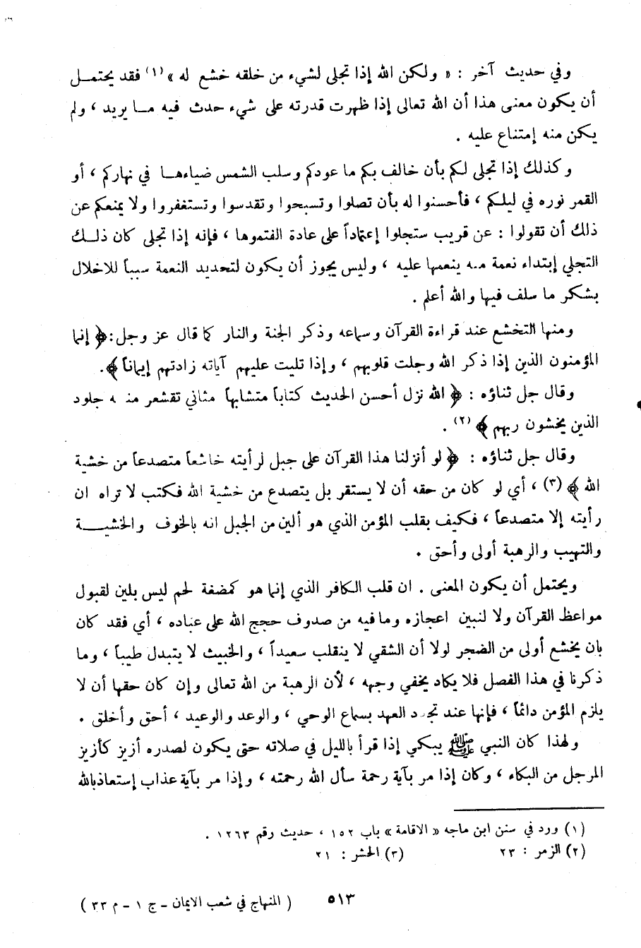 وقال جل ثناؤه: {الله نزل أحسن الحديث كتابا متشابها مثني تقشعر منه جلود الذين يخشون ربهم}.