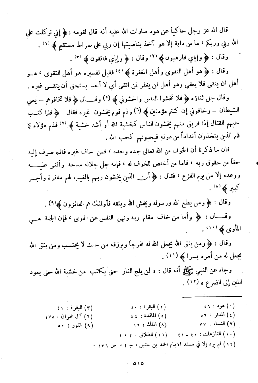 وقال جل ثناؤه {فلا تخشوا الناس واخشوني} وقال {فلا تخافوهم- يعني الشيطان- وخافوني إن كنتم مؤمنين} وذم قوم يهشون غيره فقال {فلما كتب عليهم القتال إذا فريق منهم يخشون الناس كخشية الله أو أشد خشية} فذم هؤلاء كما ذم الذين يتخذون أندادا من دونه فيحبونهم كحب الله.