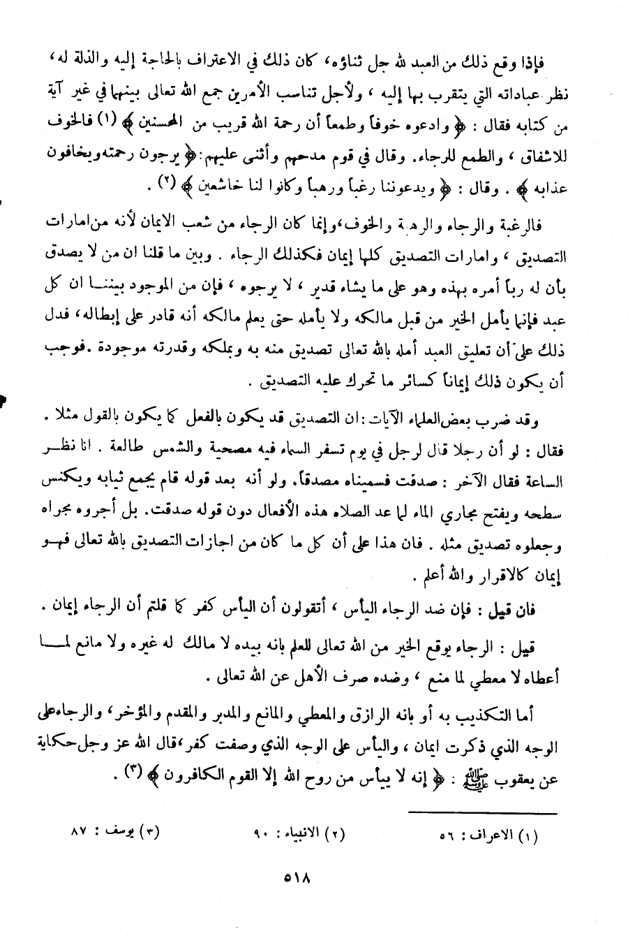 فإذا وقع ذلك من العبد لله جل ثناؤه، كان ذلك في الاعتراف بالحاجة إليه والذلة له، نظر عباداته التي يتقرب بها إليه، ولأجل تناسب الأمرين جمع الله تعالى بينهما في غير آية من كتابه فقال: {وادعوه خوفا وطمعا أن رحمة الله قريب من المحسنين} فالخوف للإشفاق، والطمع للرجاء. وقال في قوم مدحهم وأثنى عليهم: {يرجون رحمته ويخافون عذابه}. وقال: {ويدعوننا رغبا ورهبا وكانوا لنا خاشعين}.