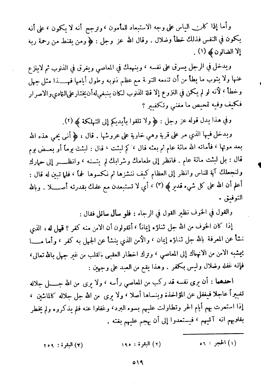 إذا كان الخوف من الله جل ثناؤه إيمانا، أتقولن أن الأمن منه كفر؟ قيل له: الذي ينشأ عن المعرفة بالله حل ثناؤه إيمان، والأمن الذي ينشأ هن الجهل به كفر، وأما ما يشبه الأمن من الانهماك إلى المعاصي، وترك أخطار العقبى بالقلب من غير جهل بالله تعالى، فإنه غفلة وضلال وليس بكفر. وهذا يقع من العبد على وجهين: