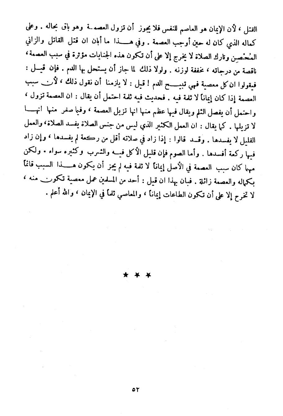 القتل، لأن الإيمان هو العاصم للنفس فلا يجوز أن تزول العصمة وهو باق بحاله. وعلى كماله الذي كان له حين أوجب العصمة. وفي هذا ما أبان أن قتل القاتل والزاني المحصن وتارك الصلاة لا يخرج إلا على أن تكون هذه الجنايات مؤثرة في سبب العصمة، ناقصة من درجاته، مخففة لوزنه. ولولا ذلك لما جاز أن يستحل بها الدم. فإن قيل: فيقولوا أن كل معصية فهي تبيح الدم! قيل: لا يلزمنا أن نقول ذلك، لأن سبب العصمة إذا كان إيمانا لا ثلمة فيه. فحديث فيه ثلمة احتمل أن يقال: أن العصمة تزول، واحتمل أن يفصل الثلم ويقال فيها عظم منها أنها تزيل العصمة، وفيما صغر منها أنها لا تزيلها. كما يقال: إن العمل الكثير الذي ليس من جنس الصلاة يفسد الصلاة، والعمل القليل لا يفسدها. وقد قالوا: إذا زاد في صلاته أقل من ركعة لم يفسدها، وإن زاد فيها ركعة أفسدها. وأما الصوم فإن قليل الأكل فيه والشرب وكثيره سواء. ولكن مهما كان سبب العصمة في الأصل إيمانا لا ثلمة فيه لم يجز أن يكون هذا السبب قائما بكماله والعصمة زائلة. فبان بهذا أن قيل: أحد من المسلمين عمل معصية تكون منه، لا تخرج إلا على أن تكون الطاعات إيمانا، والمعاصي ثلما في الإيمان، والله أعلم.