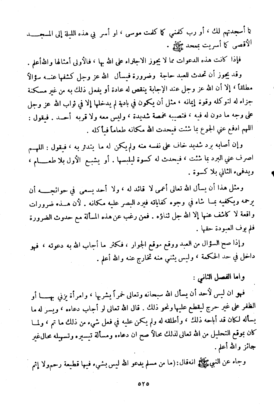 فهو أن ليس لأحد أن يسأل الله سبحانه وتعالى خمرا يشربها، وامرأة يزني بها أو الظفر على غير حرج ليقطع عليها ونحو ذلك. قال الله تعالى لو أجاب دعاءه، ويسر له ما يسأله لكان قد أباحه ذلك، وأطلقه له ولم يكن عليه فعل شيء من ذلك ما تم، ولما كان بموقع التحليل من الله تعالى لذلك محالا صح أن دعاءه ومسألة تيسيره وتسهيله محال غير جاز والله أعلم.
