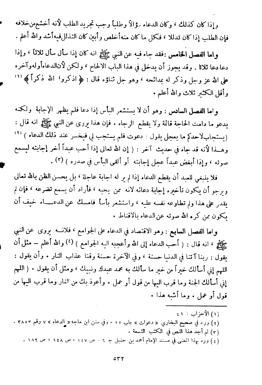 وأما الفصل الخامس: فقد جاء فيه عن النبي صلى الله عليه وسلم أنه كان إذا سأل سأل ثلاثا، وإذا دعا دعا ثلاثا. وقد يجوز أن يدخل في هذا الباب الإلحاح، ولكن لأن الدعاء اوله وآخره على الله عز وجل وذكر له بمدائحه، وهو جل ثناؤه قال: {اذكروا الله ذكرا} وأقل الكثير ثلاث والله أعلم.