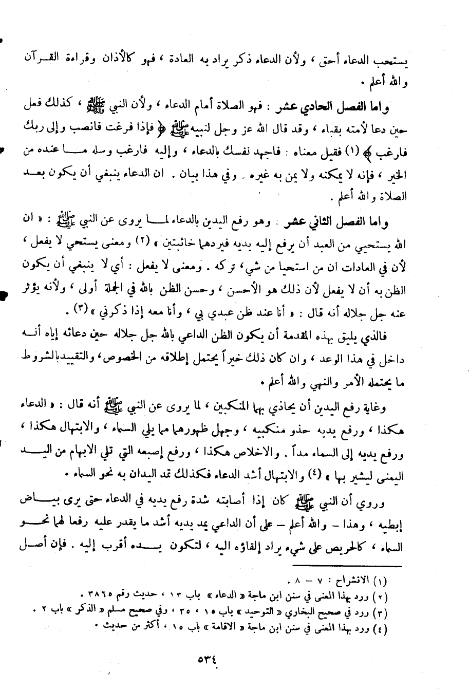 وأما الفصل الحادي عشر: فهو الصلاة أما الدعاء، ولأن النبي صلى الله عليه وسلم، كذلك فعل حين دعا لأمته بقباء، وقد قال الله عز وجل لنبيه صلى الله عليه وسلم {فإذا فرغت فانصب وإلى ربك فارغب} فقيل معناه: فأجهد نفسك بالدعاء، وإليه فارغب وسله ما عنده من الخير، فإنه لا يمكنه ولا يمكن به غيره وفي هذا بيان. أن الدعاء ينبغي أن يكون بعد الصلاة والله أعلم.
