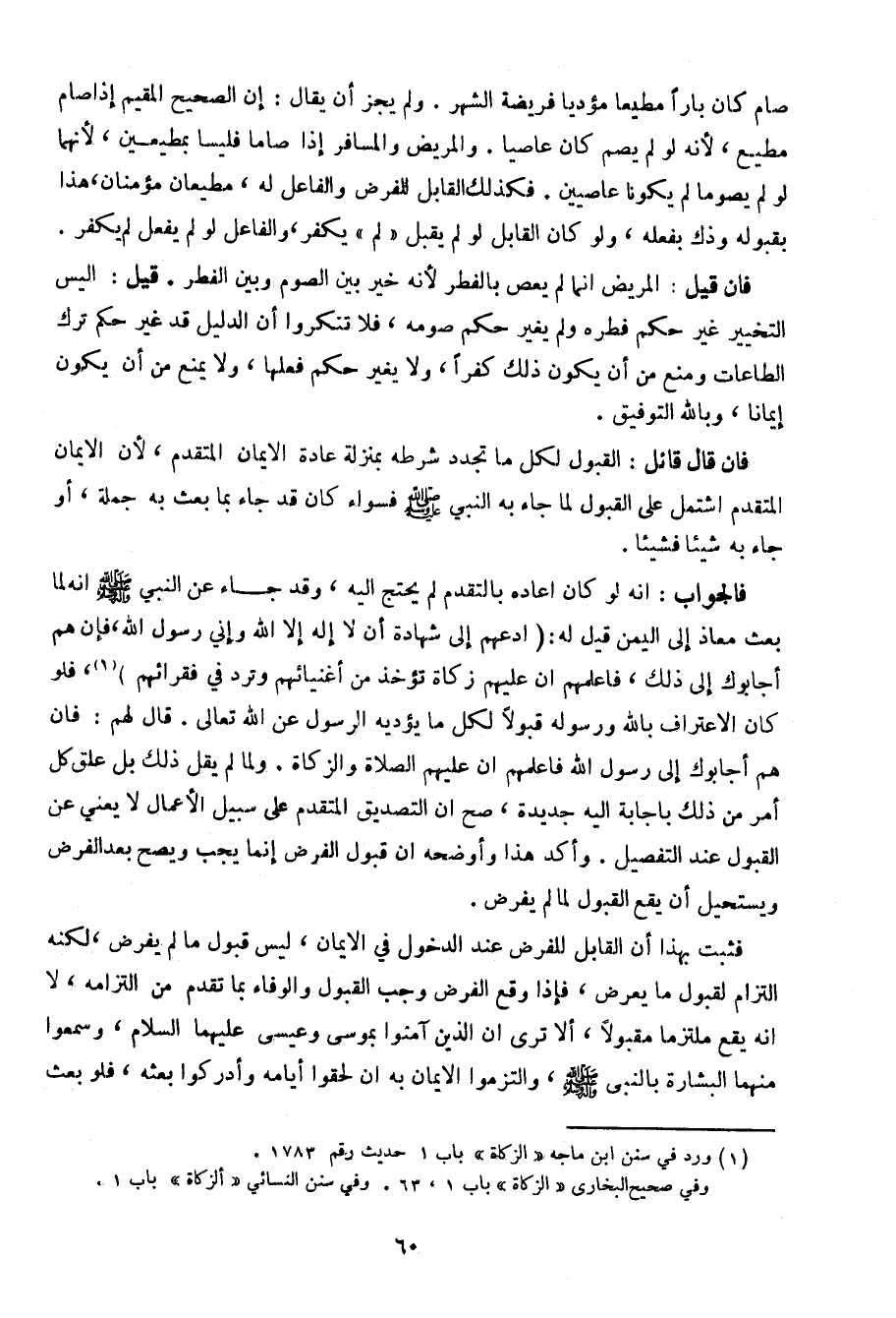 صام كان بارا مطيعا مؤديا فريضة الشهر. ولم يجز أن يقال: إن الصحيح المقيم إذا صام مطيع، لأنه لو لم يصم كان عاصيا. والمريض والمسافر إذا صاما فليسا بمطيعين، لأنهما لو لم يصوما لم يكونا عاصيين. فكذلك القابل للفرض والفاعل له، مطيعان مؤمنان، هذا بقبوله وذاك بفعله، ولو كان القابل لو لم يقبل "لم" يكفر، والفاعل لو لم يفعل لم يكفر.