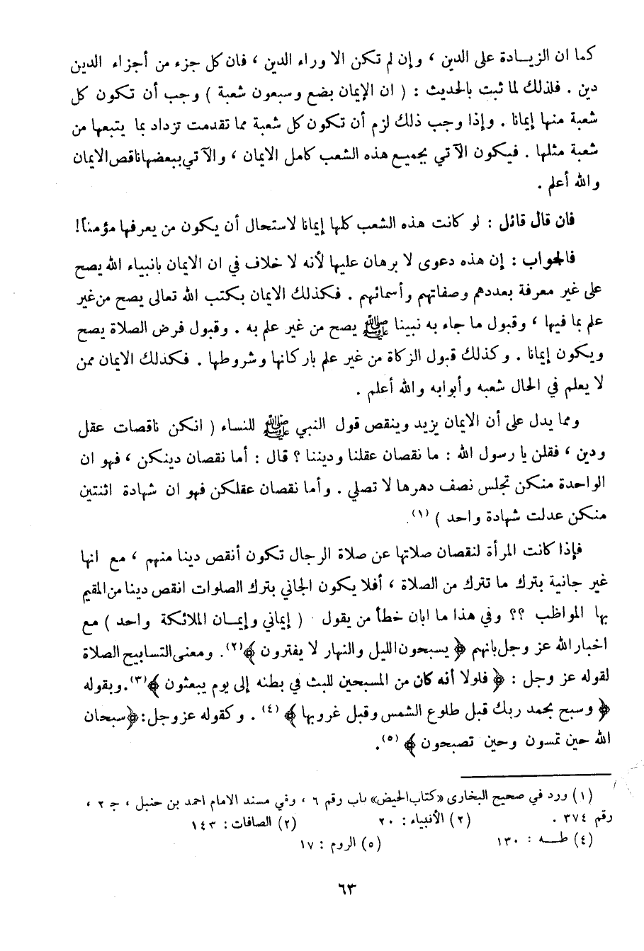 فإذا كانت المرأة لنقصان صلاتها عن صلاة الرجال تكون أنقص دينا منهم، مع أنها غير جانية بترك ما تترك من الصلاة، أفلا يكون الجاني بترك الصلوات انقص دينا من المقيم بها المواظب؟؟ وفي هذا ما أبان خطأ من يقول (إيماني وإيمان الملائكة واحد) مع أخبار الله عز وجل بأنهم {يسبحون الليل والنهار لا يفترون}. ومعنى التسابيح الصلاة لقوله عز وجل: {فلولا أنه كان من المسبحين للبث في بطنه ليوم يبعثون}. وبقوله {وسبح بحمد ربك قبل طلوع الشمس وقبل غروبها}. وكقوله عز وجل: {سبحان الله حين تمسون وحين تصبحون}.