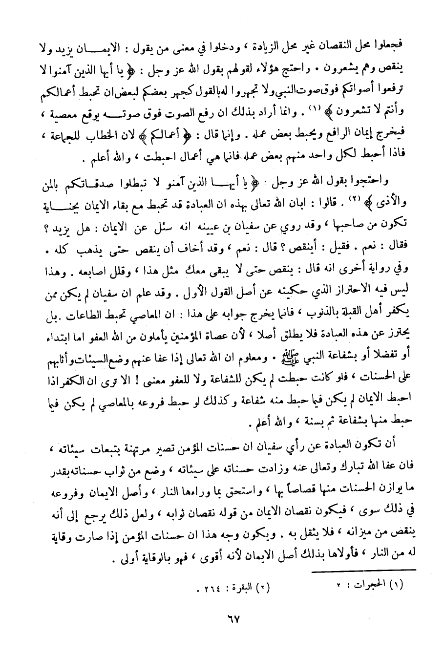 واحتجوا بقول الله عز وجل: {يا أيها الذين آمنوا لا تبطلوا صدقاتكم بالمن والأذى}. قالوا: أبان الله تعالى بهذه أن العبادة قد تحبط مع بقاء الإيمان بجناية تكون من صاحبها. وقد روي عن سفيان بن عيينه أنه سئل عن الإيمان: هل يزيد؟ فقال: نعم. فقال: أينقص؟ قال: نعم، وقد أخاف أن ينقص حتى يذهب كله. وفي رواية أخرى أنه قال: ينقص حتى لا يبقى معك مثل هذا، وقلل أصابعه. وهذا ليس فيه الاحتراز الذي حكيته عن أصل القول الأول. وقد علم أن سفيان لم يكن ممن يكفر أهل القبلة بالذنوب، فإنما يخرج جوابه عن هذا: أن المعاصي تحبط الطاعات. بل يحترز عن هذه العبادة فلا يطلق أصلا، لأن عصاة المؤمنين يأملون من الله العفو إما ابتداء أو تفضلا أو بشفاعة النبي صلى الله عليه وسلم. ومعلوم أن الله تعالى إذا عفا عنهم وضع السيئات وأثابهم على الحسنات، فلو كانت حبطت لم يكن للشفاعة ولا للعفو معنى! ألا ترى أن الكفر إذا أحبط الإيمان لم يكن فيما حبط منه شفاعة وكذلك لو حبط فروعه بالمعاصي لم يكن فيما حبط منها بشفاعة ثم بسنة، والله أعلم.