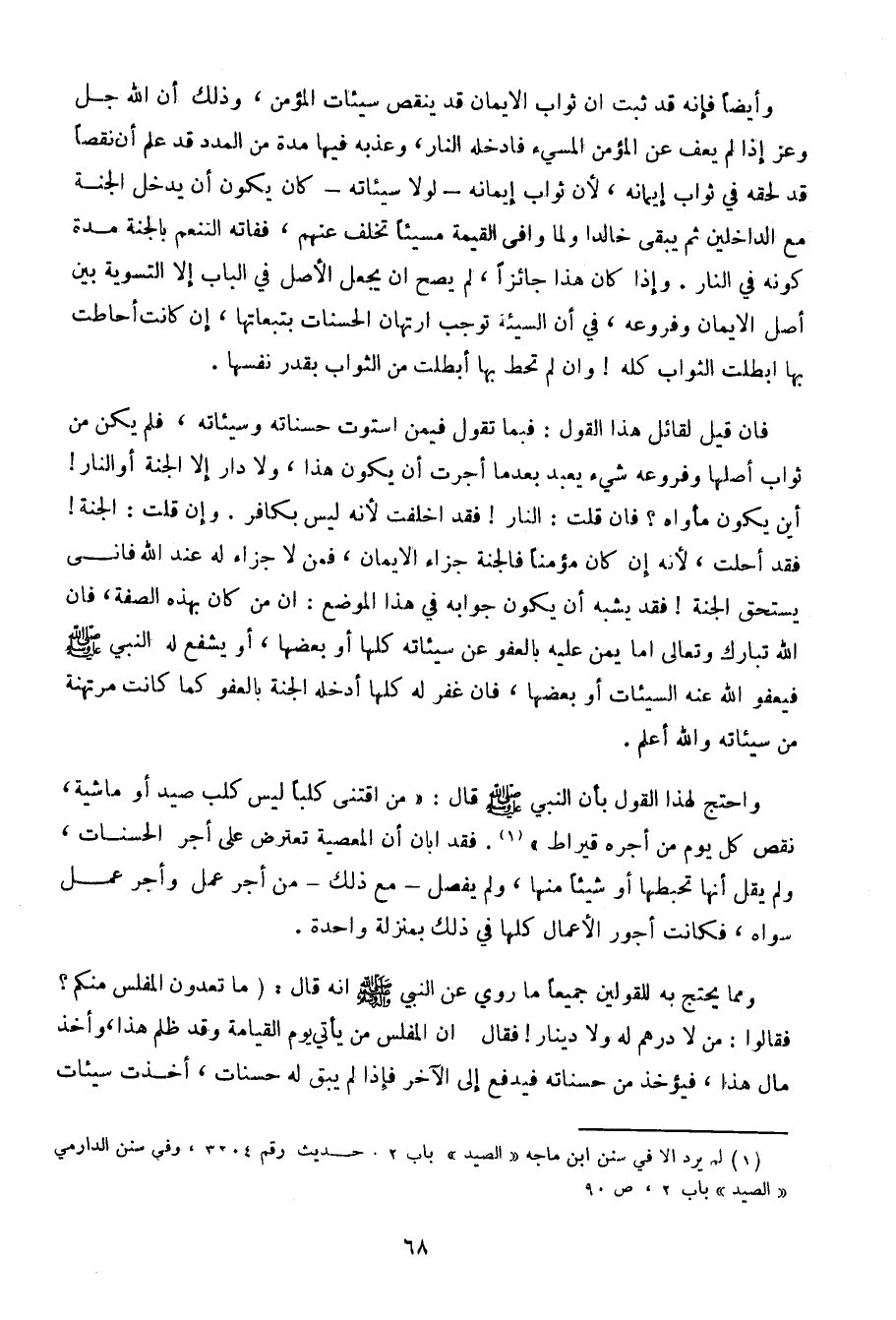 وأيضا فإنه قد ثبت أن ثواب الإيمان قد ينقص سيئات المؤمن، وذلك أن الله جل وعز إذا لم يعف عن المؤمن المسيء فأدخله النار، وعذبه فيها مدة من المدد قد علم أن نقصا قد لحقه في ثواب إيمانه، لأن ثواب إيمانه- لولا سيئاته- كان يكون أن يدخل الجنة مع الداخلين ثم يبقى خالدا ولما وافى القيمة مسيئا تخلف عنهم، ففاته التنعم بالجنة مدة كونه في النار. وإذا كان هذا جائزا، لم يصح أن يجعل الأصل في الباب إلا التسوية بين أصل الإيمان وفروعه، في أن السيئة توجب ارتهان الحسنات بتبعاتها، إن كانت أحاطت بها أبطلت الثواب كله! وإن لم تحط بها من الثواب بقدر نفسها.