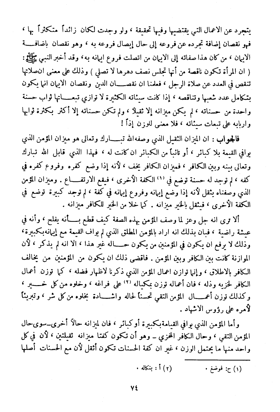 يتجرد عن الأعمال التي يقتضيها وفيها تحقيقة، ولو وجدت لكان زائدا متكثرا لها، فهو نقصان إضافة تجرده عن فروعه إلى حال إيصال فروعه به، وهو نقصان بإضافة الإيمان، من كان هذا صفاته إلى الإيمان من اتصلت فروع إيمانه به، وقد أخبر النبي صلى الله عليه وسلم: (أن المرأة تكون ناقصة من أنها تجلس نصف دهرها لا تصلي) وذلك على معنى أن صلاتها تنقص في العدد عن صلاة الرجل، فعلمنا أن نقصان الدين ونقصان الإيمان إنما يكون بتكامل عدد شعبها وتناقصه، إذا كانت سيئاته الكثيرة لا توازي تبعاتها ثواب حسنة واحدة من حسناته، لم يكن ميزانه إلا ثقيلا، ولم تكن حسناته إلا أكثر بكثرة ثوابها وأربابه على تبعات سيئاته، فلا معنى للوزن إذا!