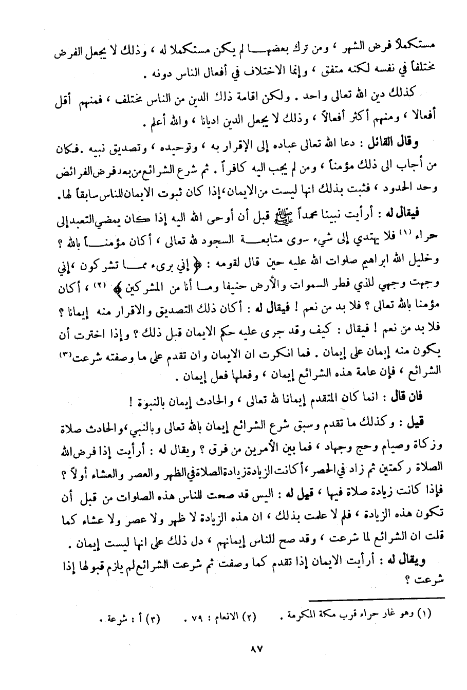 فيقال له: أرأيت نبينا محمدا صلى الله عليه وسلم قبل أن أوحى الله إليه إذا كان يمضي التعبد إلى حراء فلا يهتدي إلى شيء سوى متابعة السجود لله تعالى، أكان مؤمنا بالله؟ وخليل الله إبراهيم صلوات الله عليه حين قال لقومه: {إني برئ مما تشركون، إني وجهت وجهي للذي فطر السموات والأرض حنيفا وما أنا من المشركين}، أكان مؤمنا بالله تعالى؟ فلابد من نعم! فيقال له: أكان ذلك التصديق والإقرار منه إيمانا؟ فلابد من نعم! فيقال: كيف وقد جرى عليه حكم الإيمان قبل ذلك؟ وإذا اخترت أن يكون منه إيمان على إيمان. فما أنكرت أن الإيمان وأن تقدم على ما وصفته شرعت الشرائع، فإن عامة هذه الشرائع إيمان، وفعلها فعل إيمان.