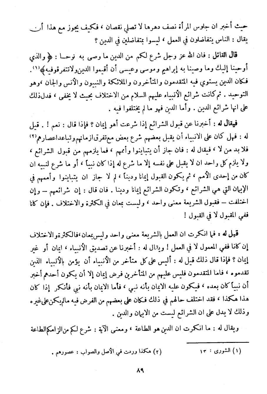 قيل له: فما أنكرت أن العمل بالشريعة معنى واحد وليس بمعان، فالكثرة والاختلاف إن كانا ففي المعمول لا في العمل! ويقال له: أخبرنا عن تصديق الأنبياء، إيمان أو غير إيمان؟ فإذا قال ذلك قيل له: أليس على كل متأخر من الأنبياء أن يؤمن بالأنبياء الذين تقدموه، فأما المتقدمون فليس عليهم من المتأخرين فرض إيمان إلا أن يكون أحدهم أخبر أن نبيان كان بعده، فيكون عليه الإيمان بأنه نبي، فأما الإيمان بأنه نبي فأنكر إذا كان هذا هكذا، فقد اختلف حالهم في ذلك فكان على بعضهم من الفرض فيه ما لم يكن على غيره وذلك لا يدل على أن الشرائع ليست من الإيمان والدين.