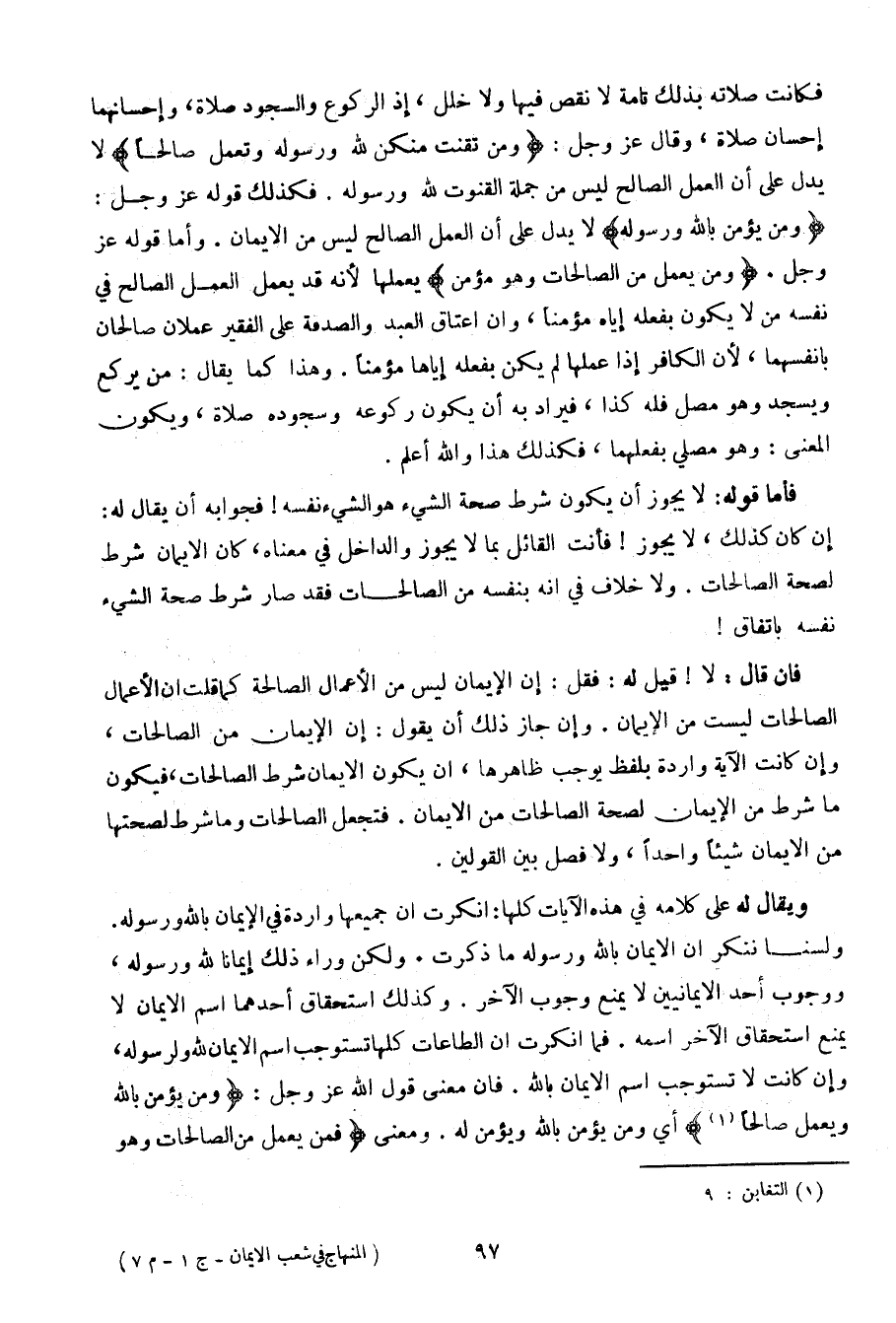 فإن قال: لا! قيل له: فقل: إن الإيمان ليس من الأعمال الصالحة كما قلت أن الأعمال الصالحات ليست من الإيمان. وإن جاز ذلك أن يقول: إن الإيمان من الصالحات، وإن كانت الآية واردة بلفظ يوجب ظاهرها، أن يكون الإيمان شرط الصالحات، فيكون ما شرط من الإيمان لصحة الصالحات من الإيمان. فتجعل الصالحات وما شرط لصحتها من الإيمان شيئا واحدا، ولا فصل بين القولين.