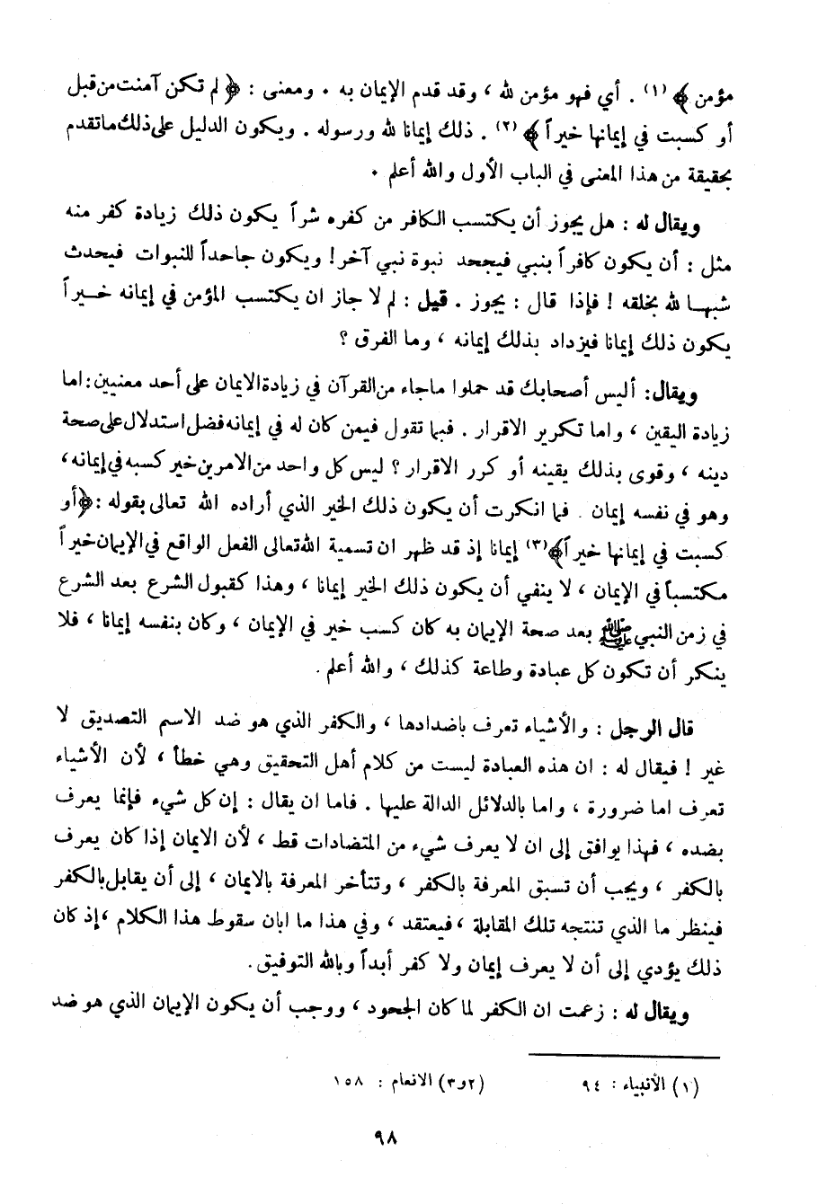ويقال: أليس أصحابك قد حملوا ما جاء من القرآن في زيادة الإيمان على أحد معنيين: أما زيادة اليقين، وأما تكرير الإقرار. فبما تقول فيمن كان له في إيمانه فضل استدلال على صحة دينه، وقوى بذلك يقينه أو كرر الإقرار؟ ليس كل واحد من الأمرين خير كسبه في إيمانه، وهو في نفسه إيمان. فما أنكرت أن يكون ذلك الخير الذي أراده الله تعالى بقوله: {أو كسبت في إيمانها خيرا} إيمانا إذ قد ظهر أن تسمية الله تعالى الفعل الواقع في الإيمان خيرا مكتسبا في الإيمان، لا ينفي أن يكون ذلك الخير إيمانا، وهذا كقبول الشرع بعد الشرع في زمن النبي صلى الله عليه وسلم بعد صحة الإيمان به كان كسب خير في الإيمان، وكان بنفسه إيمانا، فلا ينكر أن تكون كل عبادة وطاعة كذلك، والله أعلم.