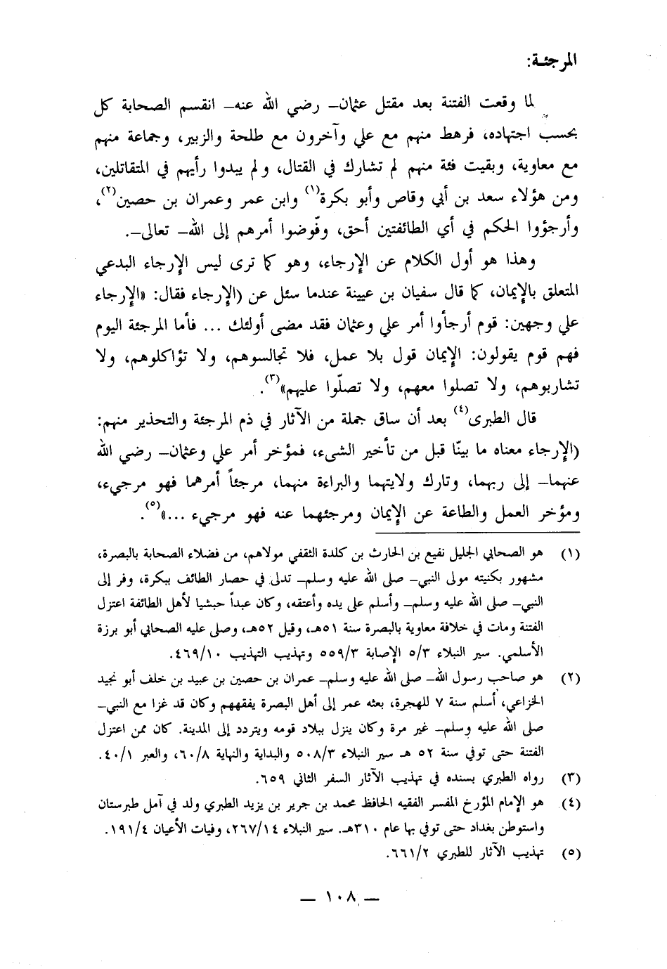 لما وقعت الفتنة بعد مقتل عثمان بن عفان - رضي الله عنه - انقسم الصحابة كل بحسب اجتهاده، فرهط منهم مع علي وآخرون مع طلحة والزبير، وجماعة منهم مع معاوية، وبقيت فئة منهم لم تشارك في القتال، ولم يبدو رأيهم في المقاتلين، ومن هؤلاء سعد بن أبي وقاص وأبو بكرة، وابن عمر وعمران بن حصين، وأرجؤوا الحكم في أي الطائفتين أحق، وفوضوا أمرهم إلى الله - تعالى -.