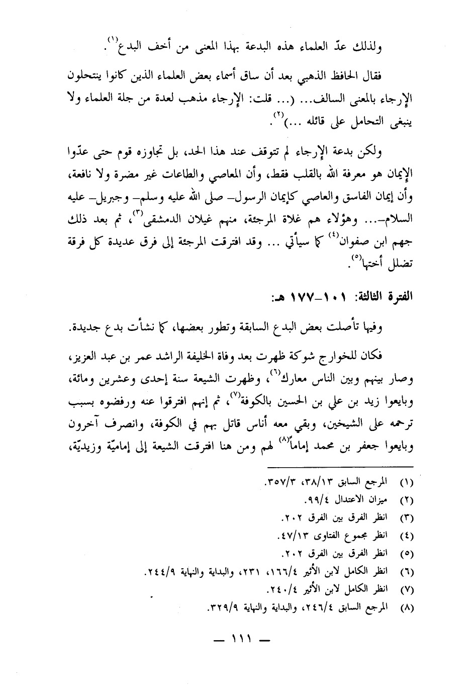 ولكن بدعة الإرجاء لم تتوقف عند هذا الحد، بل تجاوزه قوم حتى عدّوا الإيمان هو معرفة الله بالقلب فقط، وأن المعاصي والطاعات غير مضرة ولا نافعة، وأن إيمان الفاسق والعاصي كإيمان الرسول - صلى الله عليه وسلم - وجبريل - عليه السلام -.. وهؤلاء هم غلاة المرجئة، منهم غيلان الدمشقي، ثم بعد ذلك جهم ابن صفوان كما سيأتي.. وقد افترقت المرجئة إلى فرق عديدة كل فرقة تضلل أختها.