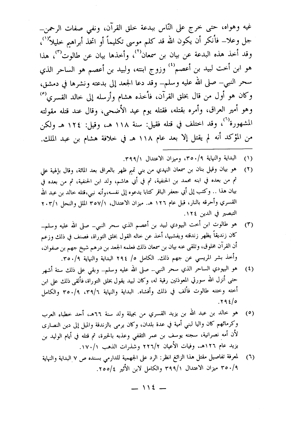 وهواه، حتى خرج على الناس ببدعة خلق القرآن، ونفي صفات الرحمن - جل وعلا - فأنكر أن يكون الله قد كلم موسى تكليماً أو اتخذ إبراهيم خليلاً، وقد أخذ هذه البدعة عن بيان بن سمعان، وأخذها بيان عن طالوت، هذا هو ابن أخت لبيد بن أعصم وزوج ابنته، ولبيد بن أعصم هو الساحر الذي سحر النبي - صلى الله عليه وسلم - وقد دعا الجعد إلى بدعته ونشرها في دمشق، وكان هو أول من قال بخلق القرآن، فأخذه هشام وأرسله على خالد القسري وهو أمير العراق، وأمره بقتله، فقتله يوم عيد الأضحى، وقال عند قتله مقولته المشهورة، وقد اختلف في قتله فقيل سنة 118هـ، وقيل 124هـ، ولكن من المؤكد أن لم يقتل إلا بعد عام 118هـ في خلافة هشام بن عبد الملك.