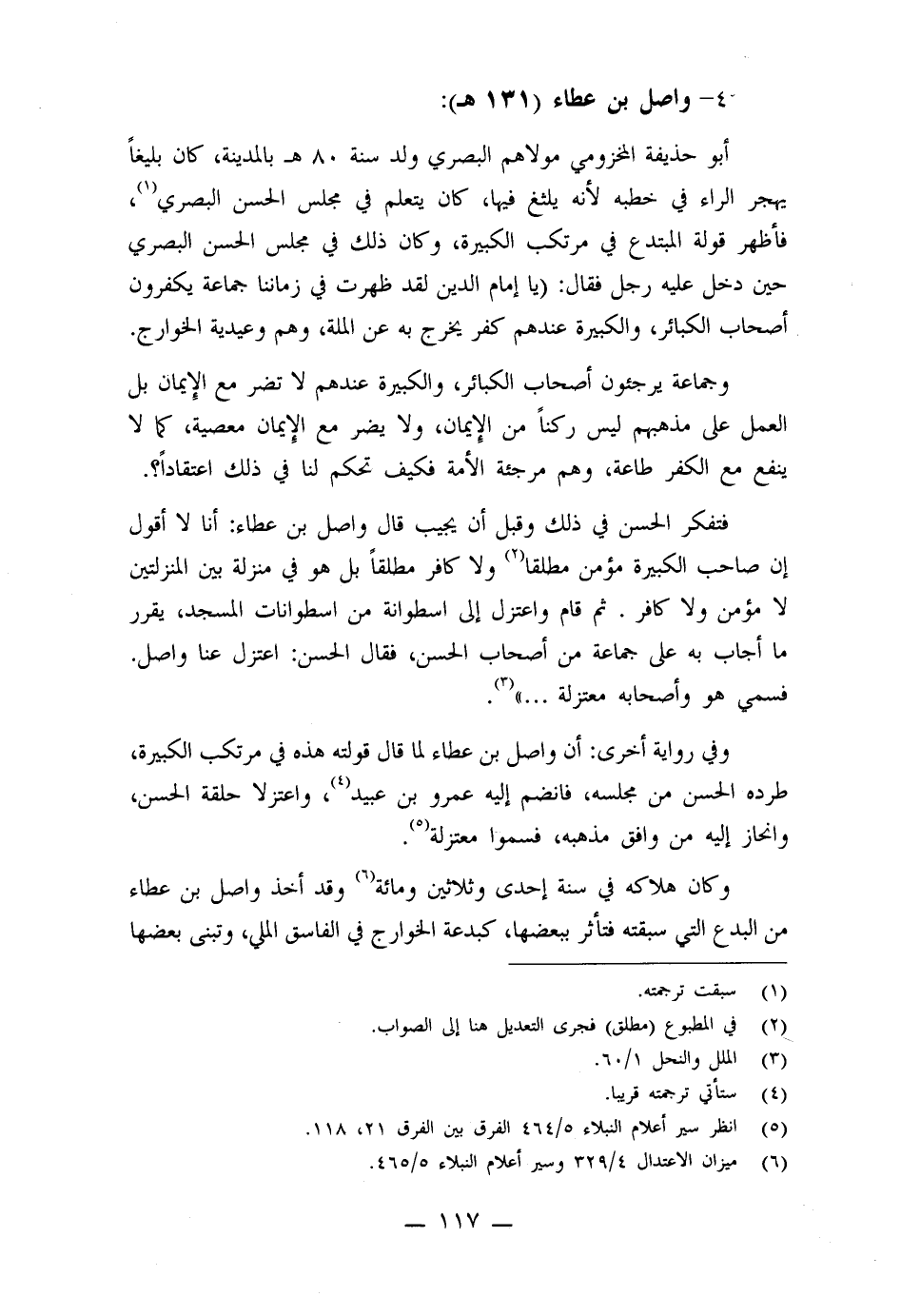 فتفكر الحسن في ذلك وقبل أن يجيب قال واصل بن عطاء: أنا لا أقول إن صاحب الكبيرة مؤمن مطلقاً ولا كافر مطلقاً بل هو في منزلة بين المنزلتين لا مؤمن ولا كافر، ثم قام واعنزل إلى اسطوانة من اسطوانات المسجد، يقرر ما أجاب به على جماعة من أصحاب الحسن، فقال الحسن: اعتزل عنا واصل، فسمي هو وأصحابه معتزلة ... ".