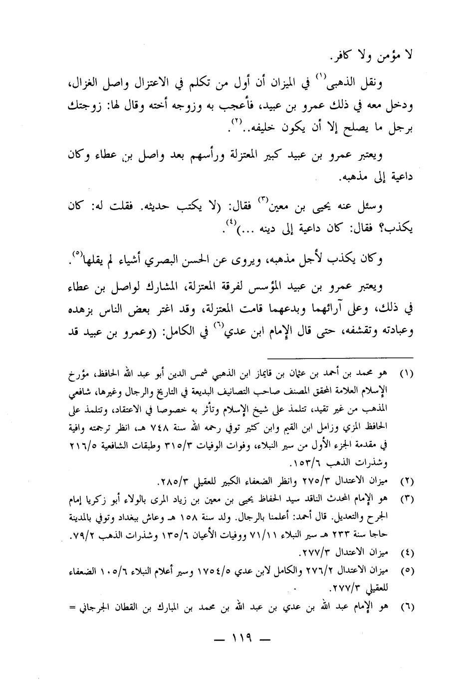 ويعتبر عمرو بن عبيد المؤسس لفرقة المعتزلة، وقد اغتر بعض الناس بزهده وعبادته وتشقفه، حتى قال الإمام ابن عدي في الكامل: (وعمرو بن عبيد قد