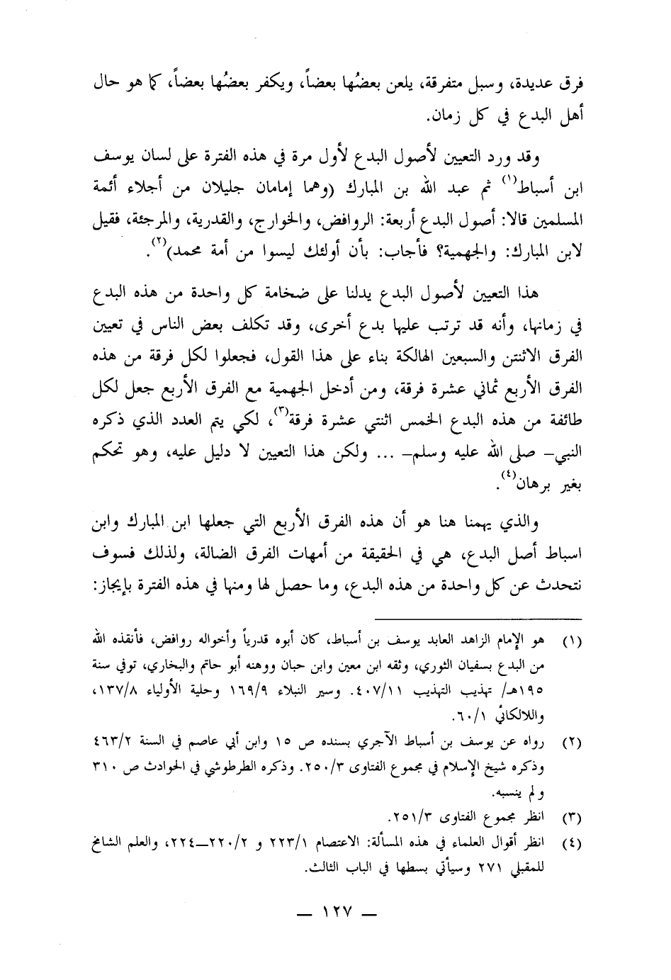وقد ورد التعيين لأصول البدع لأول مرة في هذه الفترة على لسان يوسف ابن أسباط ثم عبد الله بن المبارك (وهما إمامان جليلان من أئمة المسلمين قالا: أصول البدع أربعة: الروافض، والخوارج، والقدرية، والمرجئة، فقيل لابن المبارك: والجهمية؟ فأجاب: بأن أولئك ليسوا من أمة محمد) .