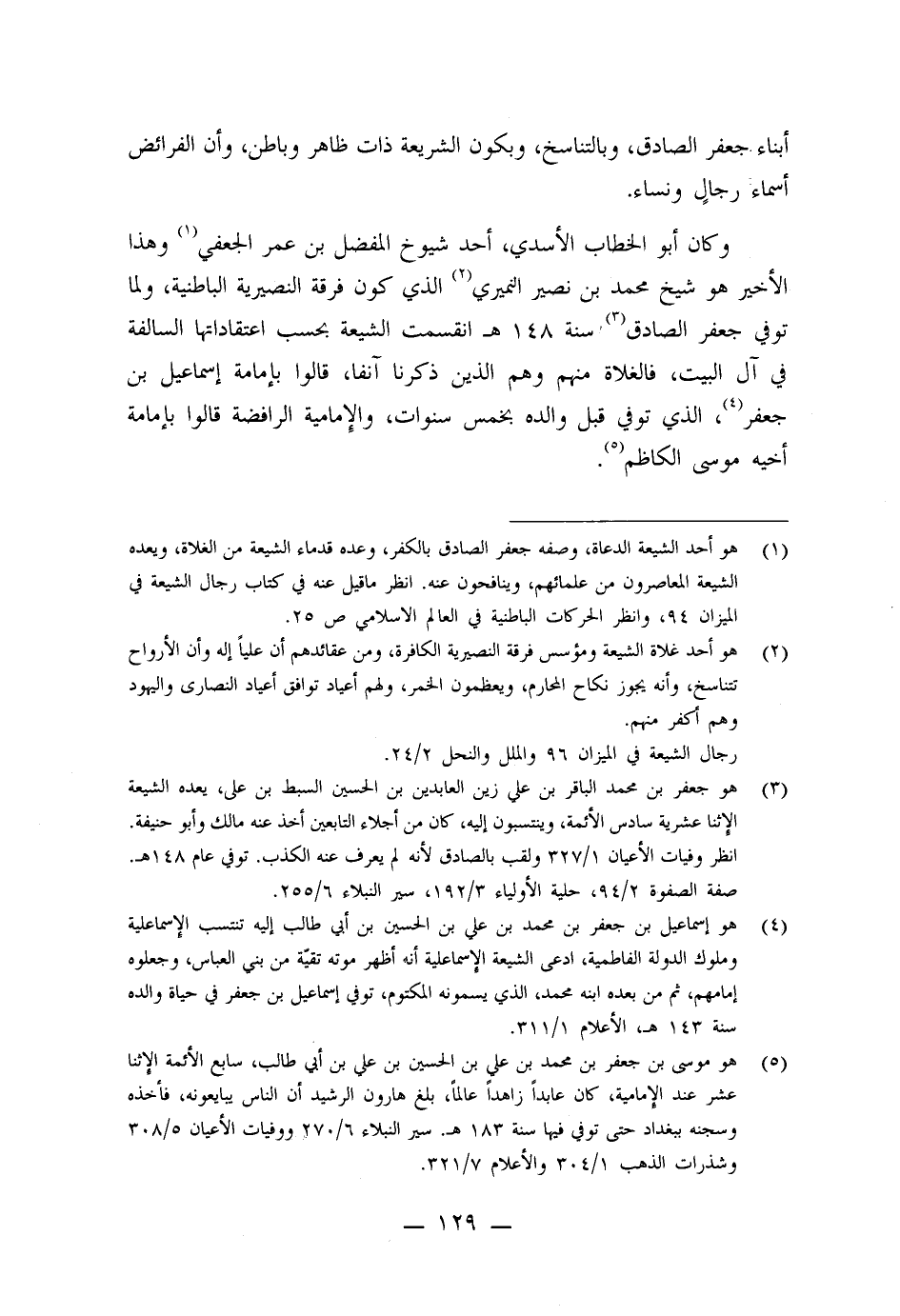 أبناء جعفر الصادق، وبالتناسخ، وبكون الشريعة ذات ظاهر وباطن، وأن الفرائض أسماء رجال ونساء.