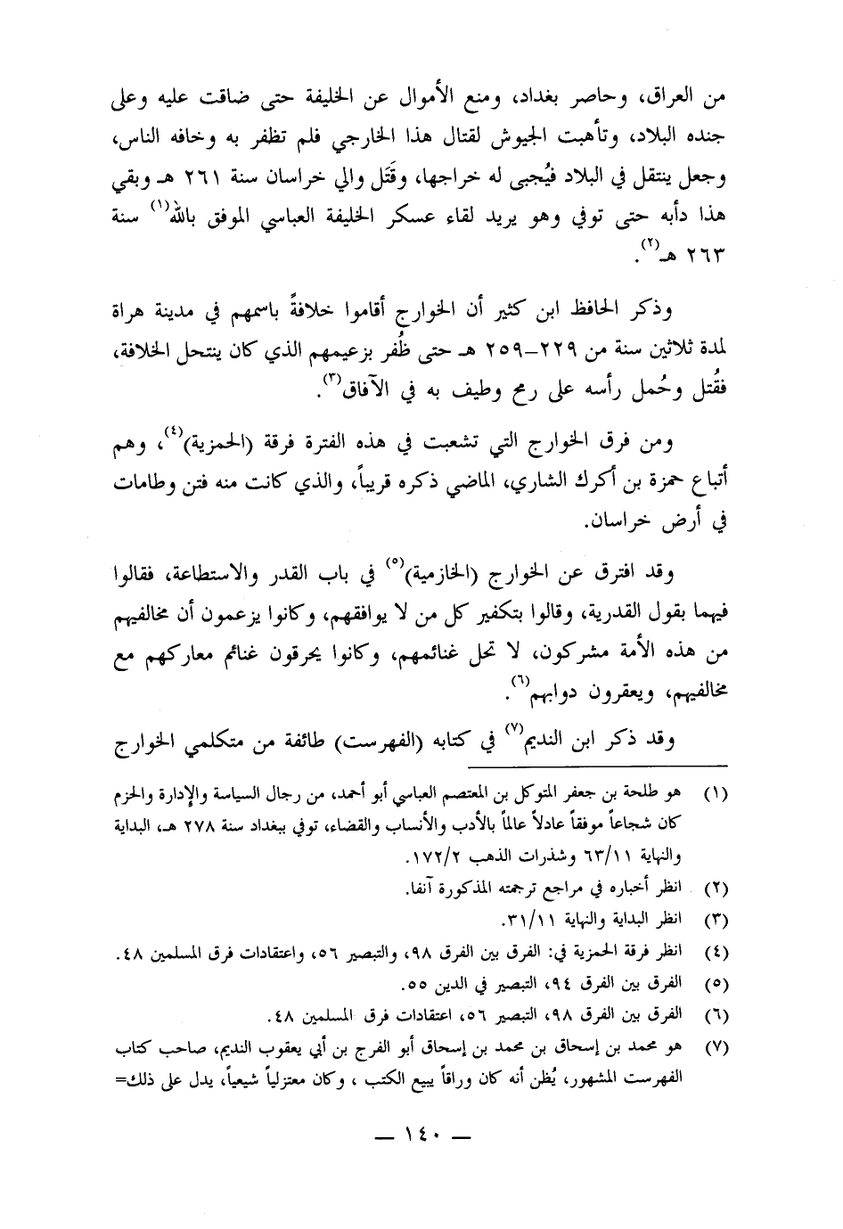 وقد ذكر ابن النديم في كتابه (الفهرست) طائفة من متكلمي الخوارج