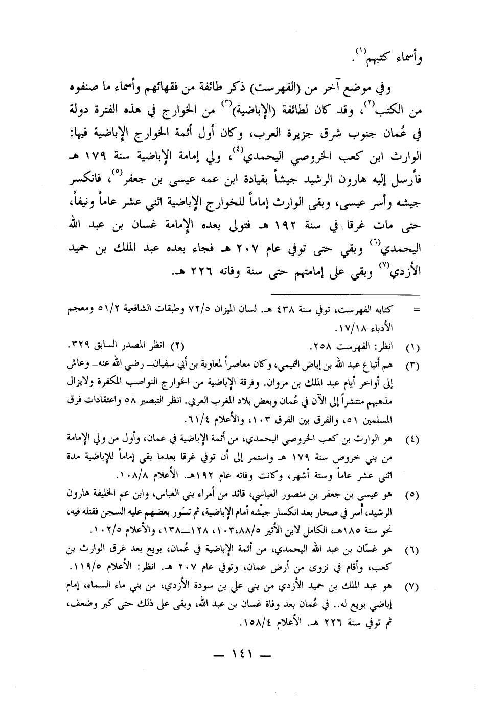 وفي موضع آخر من (الفهرست) ذكر طائفة من فقهائهم وأسماء ما صنفوه من الكتب، وقد كان لطائفة (الإباضية) من الخوارج في هذه الفترة دولة في عمان جنوب شرق جزيرة العرب، وكان أول أئمة الخوارج الإباضية فيها: الوارث ابن كعب الخروصي اليحمدي، ولي إمامة الإباضية سنة 179هـ فأرسل إليه هارون الرشيد جيشاً بقيادة ابن عمه عيسى بن جعفر، فانكسر جيشه وأسر عيسى، وبقي الوارث إماماً للخوارج الإباضية اثني عشر عاماً ونيفاً، حتى مات غرقاً في سنة 192هـ فتولى بعده الإمامة غسان بن عبد الله اليحمدي وبقي حتى توفي عام 207هـ فجاء بعده عبد الملك بن حميد الأزدي وبقي على إمامتهم حتى سنة وفاته 226هـ.