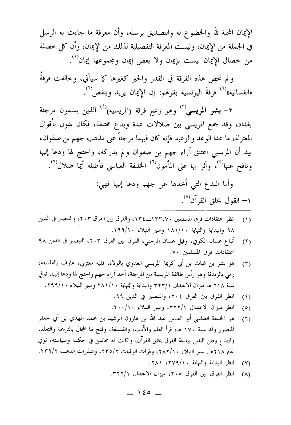 2) بشر المريسي وهو زعيم فرقة (المريسية) الذين يسمون مرجئة بغداد، وقد جمع المريسي بين ضلالات عدة وبدع مختلفة، فكان يقول بأقوال المعتزلة، ما عدا الوعد والوعيد فإنه كان فيهما مرجئاً على مذهب جهم بن صفوان، بيد أن المريسي اعتنق آراء جهم بن صفوان ولم يدركه، واحتج لها ودعا إليها ونافح عنها، وأثر بها على المأمون الخليفة العباسي فأضله أيما ضلال.