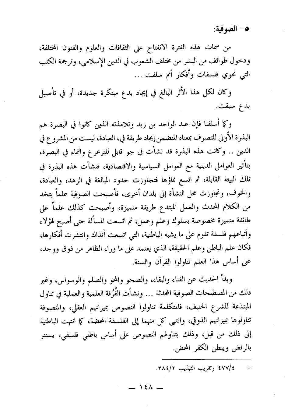 وبدأ الحديث عن الفناء والبقاء، والصحو والمحو والصلم والوسواس، وغير ذلك من المصطلحات الصوفية المحدثة.. ونشأت الفُرقة العلمية والعملية في تناول المبتدعة للشرع الحنيف، فالمتكلمة تناولوا النصوص بميزانهم العقلي، والمتصوفة تناولوها بميزانهم الذوقي، وانتهى كل منهما إلى الفلسفة المحضة، كما انتهت الباطنية إلى ذلك من قبل، وذلك بتناولهم النصوص على أساس باطني فلسفي، يستتر بالرفض ويبطن الكفر المحض.