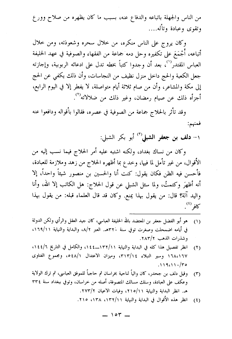 وكان من نساك بغداد، ولكنه اشتبه عليه أمر الحلاج فيما نسب إليه من الأقوال، من غير تأمل لما فيها، وخدع بما أظهره الحلاج من زهد وملازمة للعبادة، فأحسن فيه الظن فكان يقول: كنت أنا والحسين بن منصور شيئاً واحداً، إلا أنه أظهر وكتمت، ولما سئل الشبلي عن قول الحلاج: هل الكاتب إلا الله، وأنا واليد آلة؟ قال: من يقول بهذا يمنع. وكان قد قال العلماء قبله: من يقول بهذا كافر.