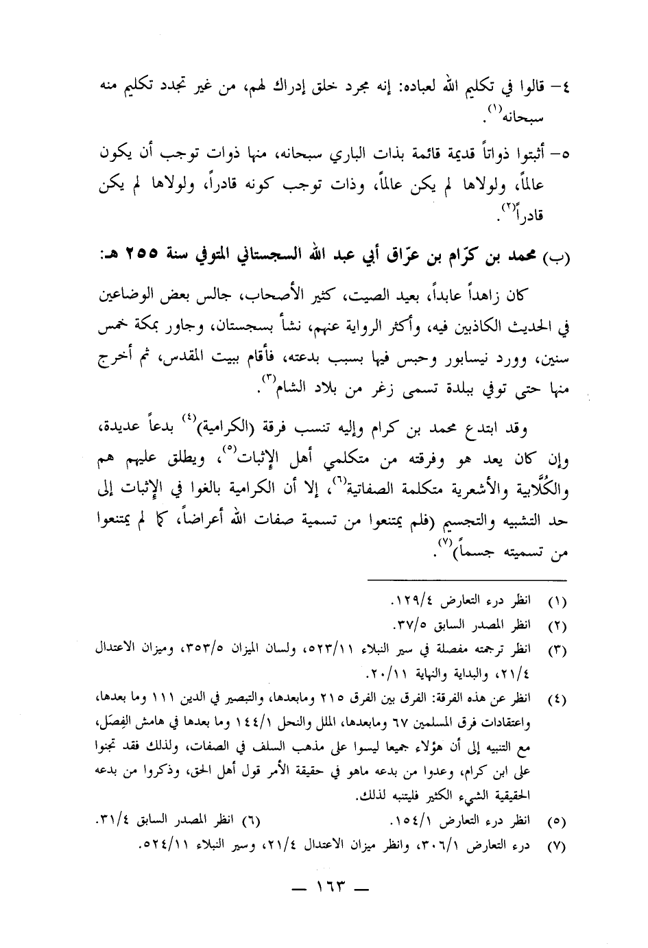 (ب) محمد بن كرام بن عراق أبي عبد الله السجستاني المتوفي سنة 255هـ: