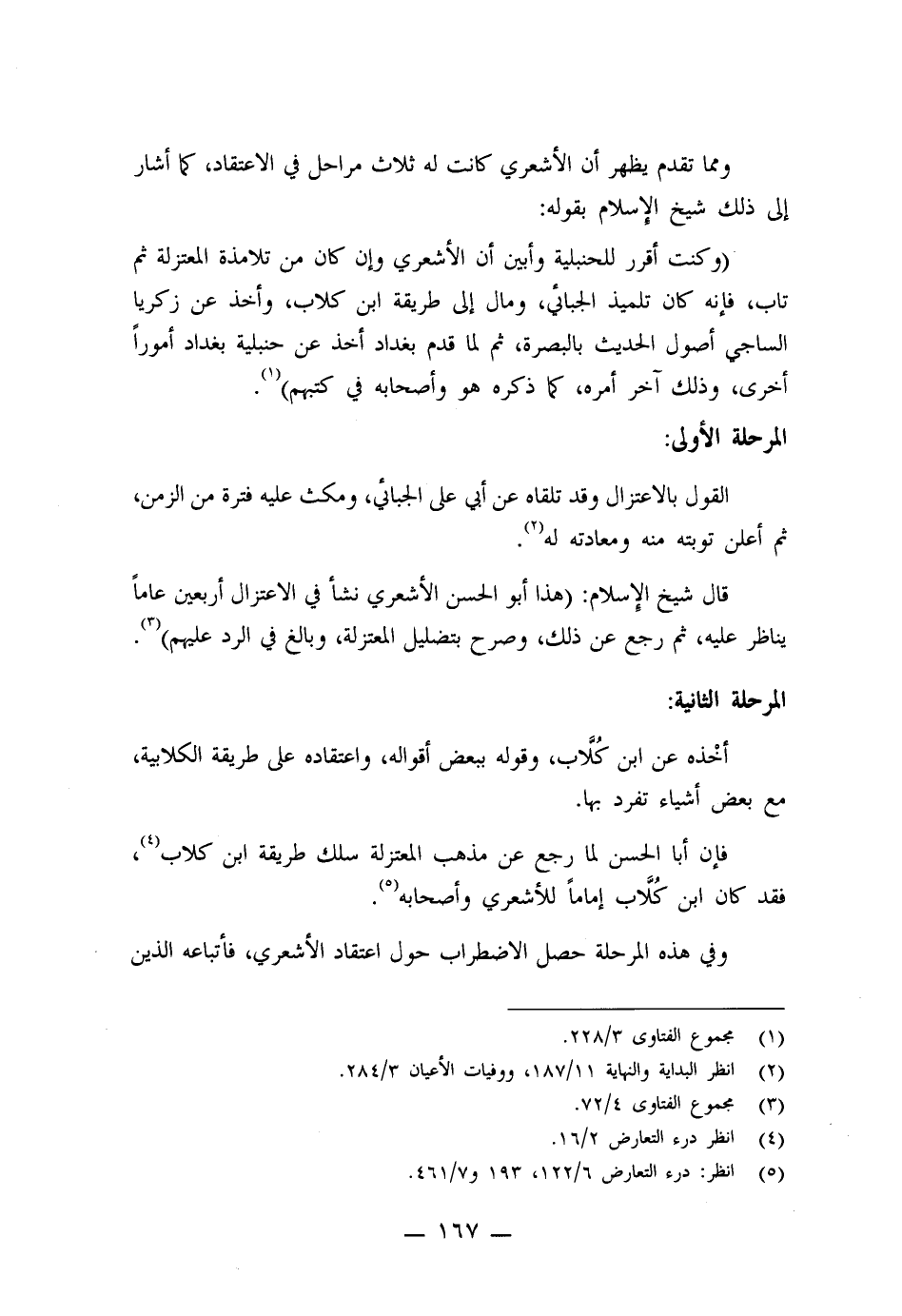 ومما تقدم يظهر أن الأشعري كانت له ثلاث مراحل في الاعتقاد، كما أشار إلى ذلك شيخ الإسلام بقوله: