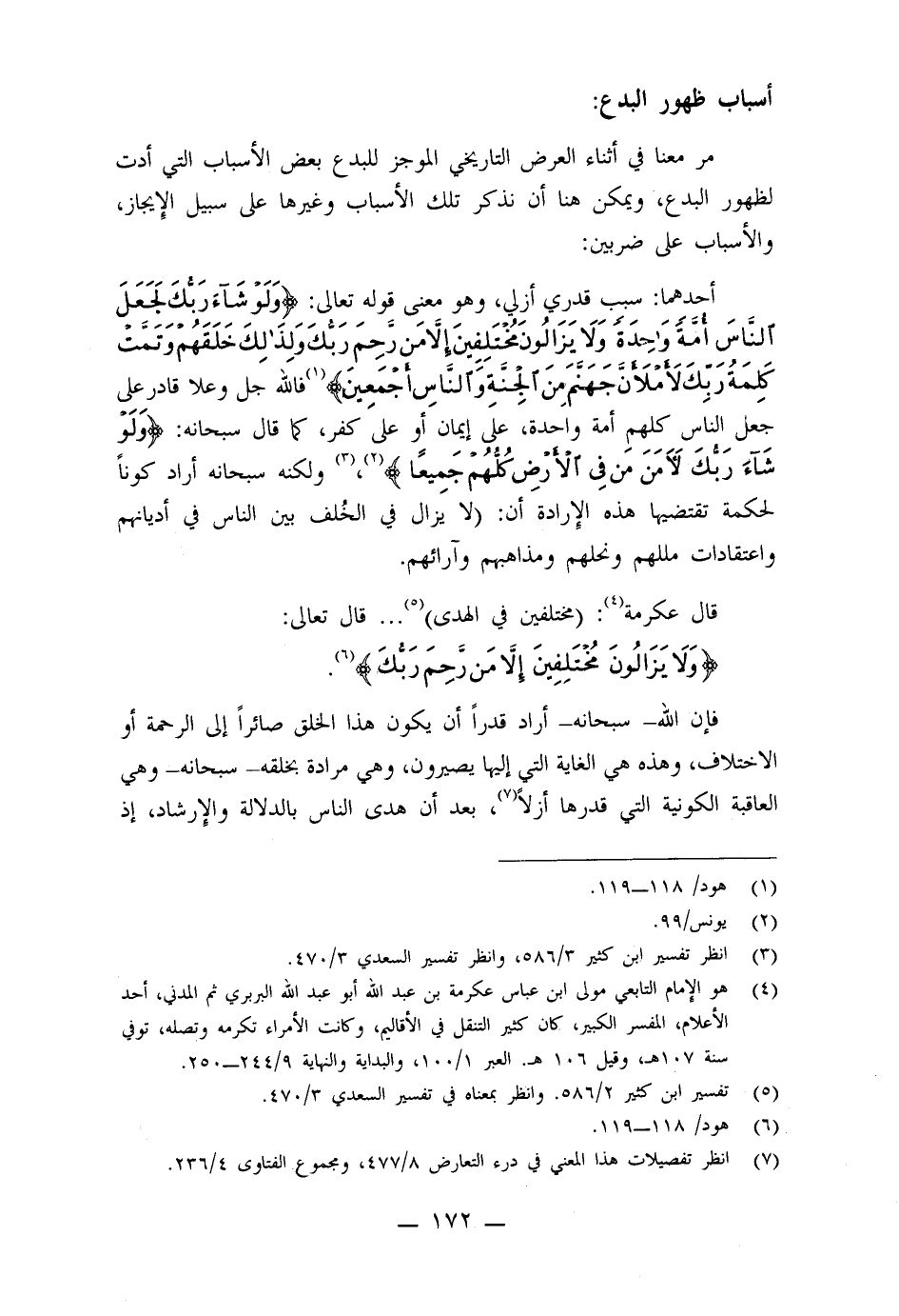 أحدهما: سبب قدري أزلي: وهو معنى قوله تعالى (ولو شاء ربك لجعل الناس أمة واحدة ولا يزالون مختلفين إلا من رحم ربك ولذلك خلقهم وتمت كلمة ربك لأملأن جهنم من الجنة والناس أجمعين) فالله جل وعلا قادر على جعل الناس كلهم أمة واحدة، على إيمان أو على كفر، كما قال سبحانه: (ولو شاء ربك لآمن من في الأرض كلهم جميعاً) ، ولكنه سبحانه أراد كوناً لحكمة تقتضيها هذه الإرادة أن: (لا يزال في الخلف بين الناس في أديانهم واعتقادات مللهم ونحلهم ومذاهبهم وآرائهم.