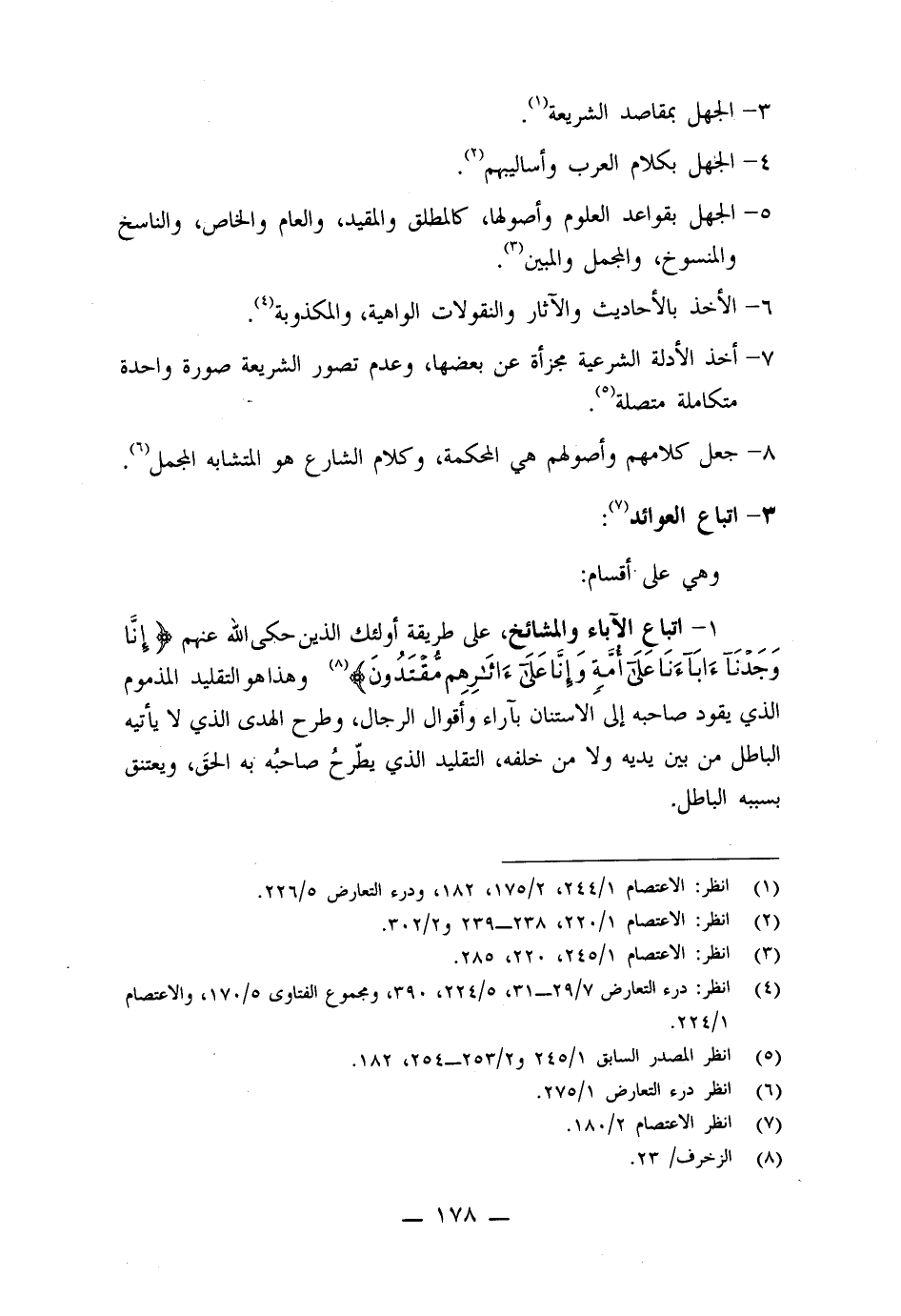 1- اتباع الآباء والمشائخ: على طريقة أولئك الذين حكى الله عنهم (إنا وجدنا اباءنا على أمة وإنا على اثرهم مقتدون) وهذا هو التقليد المذموم الذي يقود صاحبه إلى الاستنان بآراء واقوال الرجال، وطرح الهدى الذي لا يأتيه الباطل من بين يديه ولا من خلفه، التقليد الذي يطرح صاحبه به الحق، ويعتنق بسببه الباطل.
