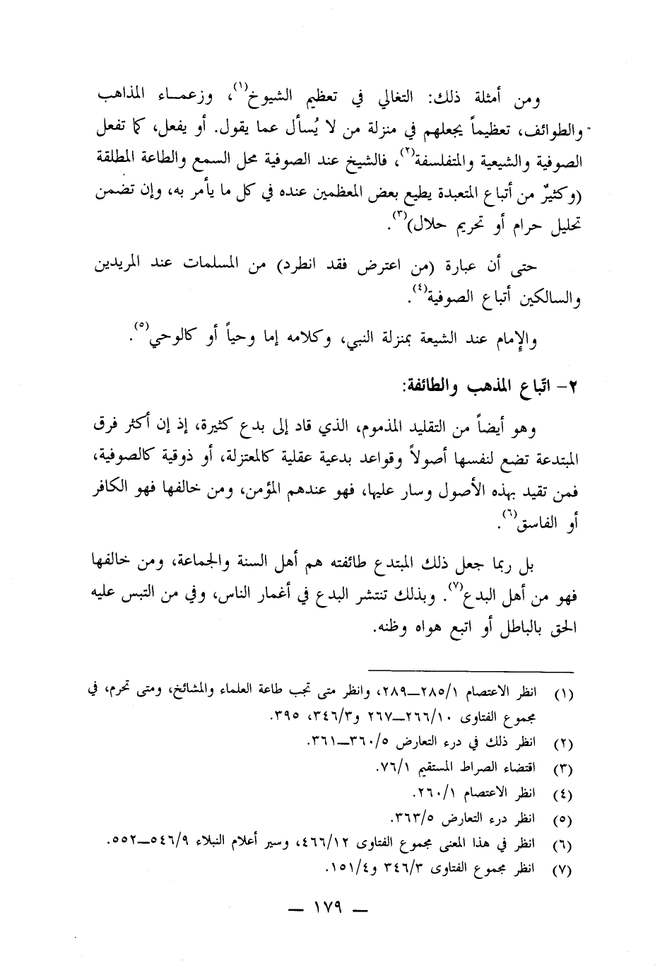 ومن أمثلة ذلك: التغالي في تعظيم الشيوخ، وزعماء المذاهب والطوائف، تعظيماً يجعلهم في منزلة من لا يسال عما يقول. أو يفعل، كما تفعل الصوفية والشيعية والمتفلسفة، فالشيخ عند الصوفية محل السمع والطاعة المطلقة (وكثير من أتباع المتعبدة يطيع بعض المعظمين عنده في كل ما يأمر به، وإن تضمن تحليل حرام أو تحريم حلال) .