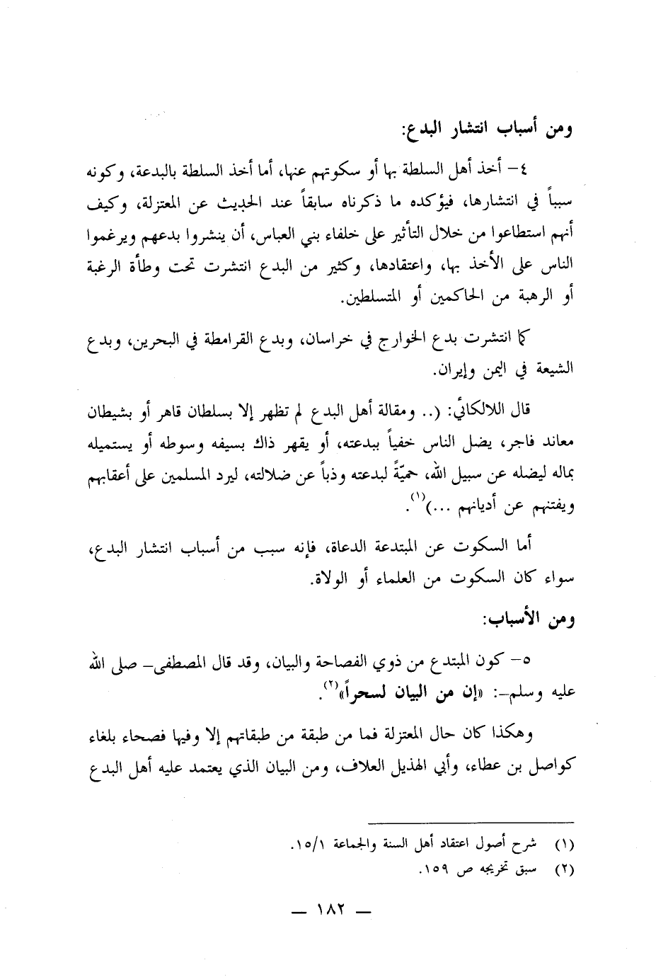 4- أخذ أهل السلطة بها أو سكوتهم عنها: أما أخذ السلطة بالبدعة، وكونه سبباً في انتشارها، فيؤكده ما ذكرناه سابقاً عند الحديث عن المعتزلة، وكيف أنهم استطاعوا من خلال التأثير على خلفاء بني العباس، أن ينشروا بدعهم ويرغموا الناس على الأخذ بها، واعتقاها، وكثير من البدع انتشرت تحت وطأة الرغبة أو الرهبة من الحاكمين أو المتسلطين.
