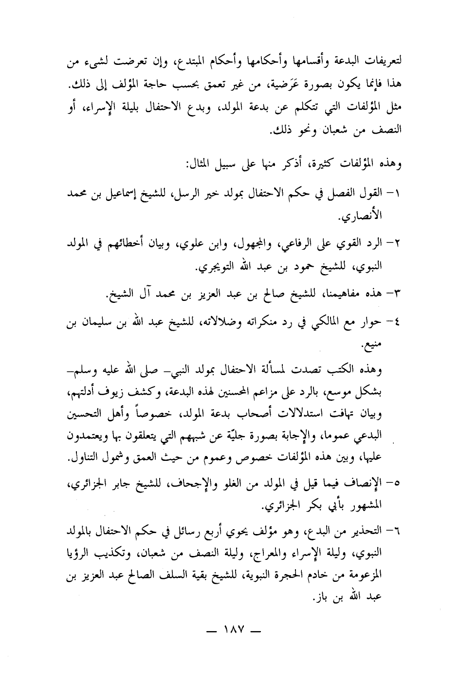 وهذه الكتب تصدت لمسألة الاحتفال بمولد النبي - صلى الله عليه وسلم - بشكل موسع، بالرد على مزاعم المحسنين لهذه البدعة، وكشف زيوف أدلتهم، وبيان تهافت استدلالات أصحاب بدعة المولد، خصوصاً وأهل التحسين البدعي عموماً، والإجابة بصورة جليّة عن شبههم التي يتعلقون بها ويعتمدون عليها، وبين هذه المؤلفات خصوص وعموم من حيث العمق وشمول التناول.