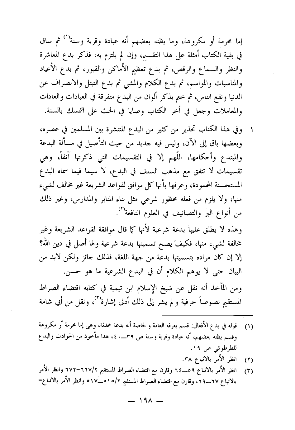 إما محرمة أو مكروهة، وما يظنه بعضهم أنها عبادة وقربة وسنة ثم ساق في بقية الكتاب أمثلة على هذا التقسيم وإن لم يلتزم به، فذكر بدع المعاشرة والنظر والسماع والرقص، ثم بدع تعظيم الأماكن والقبور، ثم بدع الأعياد والمناسبات والمواسم، ثم بدع الكلام والمشي ثم بدع التبتل والانصراف عن الدنيا ونفع الناس، ثم ختم بذكر ألوان من البدع متفرقة في العبادات والعادات والمعاملات وجعل في آخر الكتاب وصايا في الحث على التمسك بالسنة.