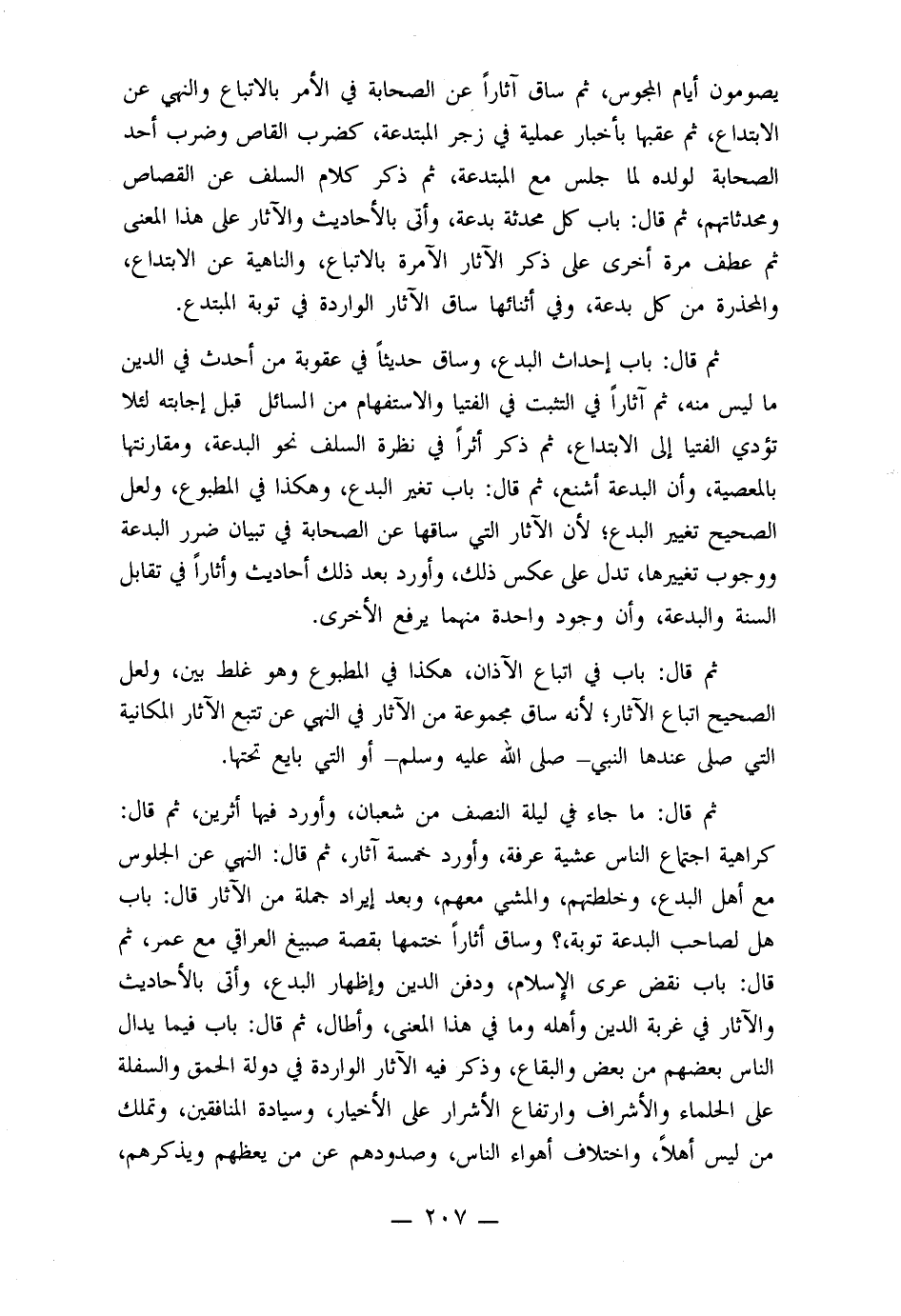 يصومون أيام المجوس, ثم ساق آثار عن الصحابة في الأمر بالإتباع والنهي عن الابتداع, ثم عقبها بأخبار عمليه في زجر المبتدعة, كضرب القاص وضرب أحد الصحابة لولده لما جلس مع المبتدعة, ثم ذكر كلام السلف عن القصاص ومحدثاتهم , ثم قال: باب كل محدثة بدعة, وأتى بالأحاديث والآثار على هذا المعنى ثم عطف مرة أخرى على ذكر الآثار الآمرة بالاتباع, والناهية عن الابتداع, والمحذرة من كل بدعة, وفي أثنائها ساق الآثار الواردة في توبة المبتدع.