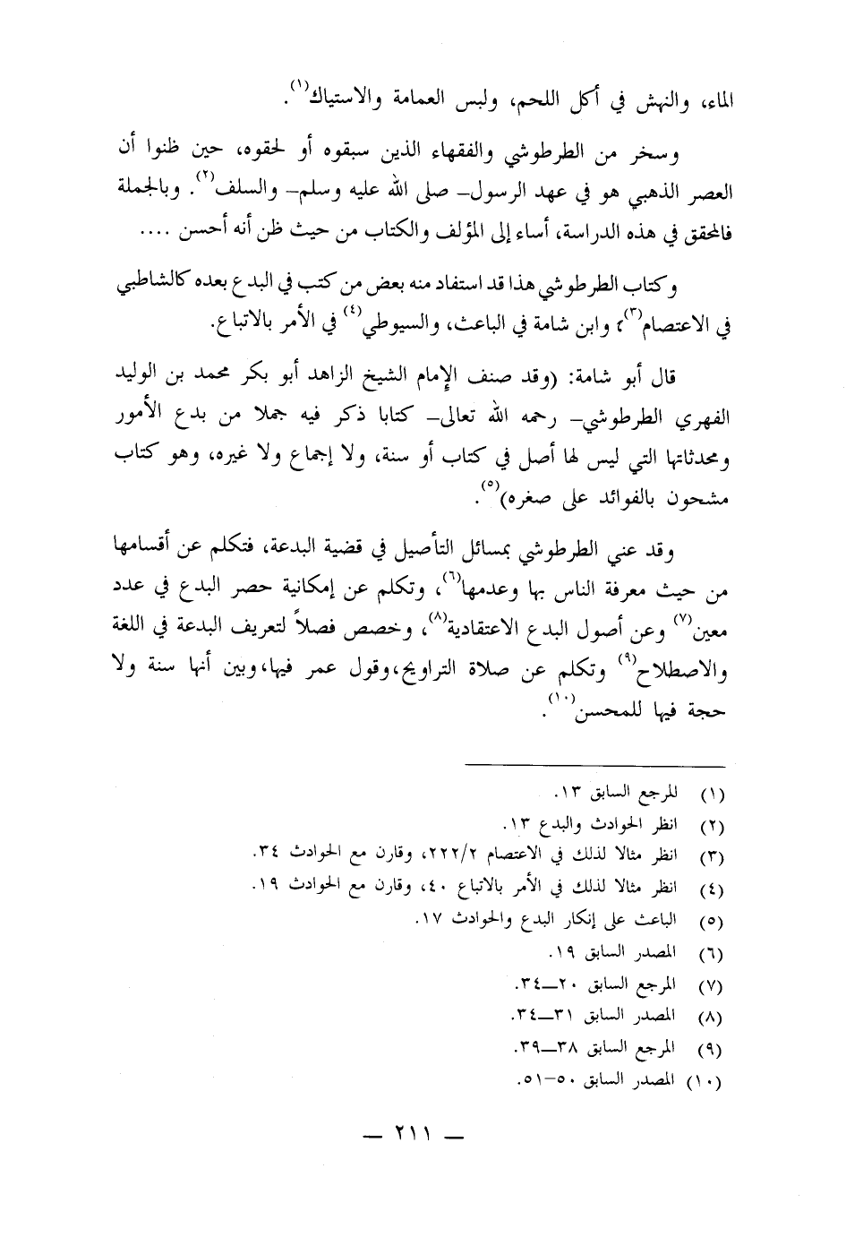 قال أبو شامة: (وقد صنف الإمام الشيخ الزاهد أبو بكر محمد بن الوليد الفهري الطرطوشي- رحمه الله تعالى- كتاباً ذكر فيه جملاً من بدع الأمور ومحدثاتها التي ليس لها أصل في كتاب أو سنة, ولا إجماع ولا غيره, وهو كتاب مشحون بالفوائد على صغره) .