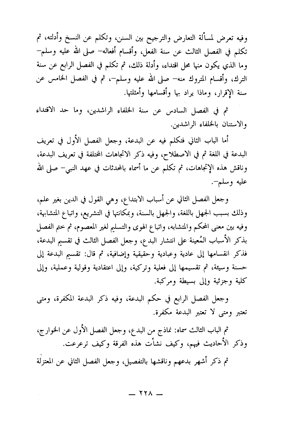 وفيه تعرض لمسألة التعارض والترجيح بين السنن، وتكلم عن النسخ وأدلته، ثم تكلم في الفصل الثالث عن سنة الفعل، وأقسام أفعاله - صلى الله عليه وسلم - وما الذي يكون منها محل اقتداء، وأدلة ذلك، ثم تكلم في الفصل الرابع عن سنة الترك، وأقسام المتروك منه - صلى الله عليه وسلم -، ثم في الفصل الخامس عن سنة الإقرار، وماذا يراد بها، وأقسامها وأمثلتها.