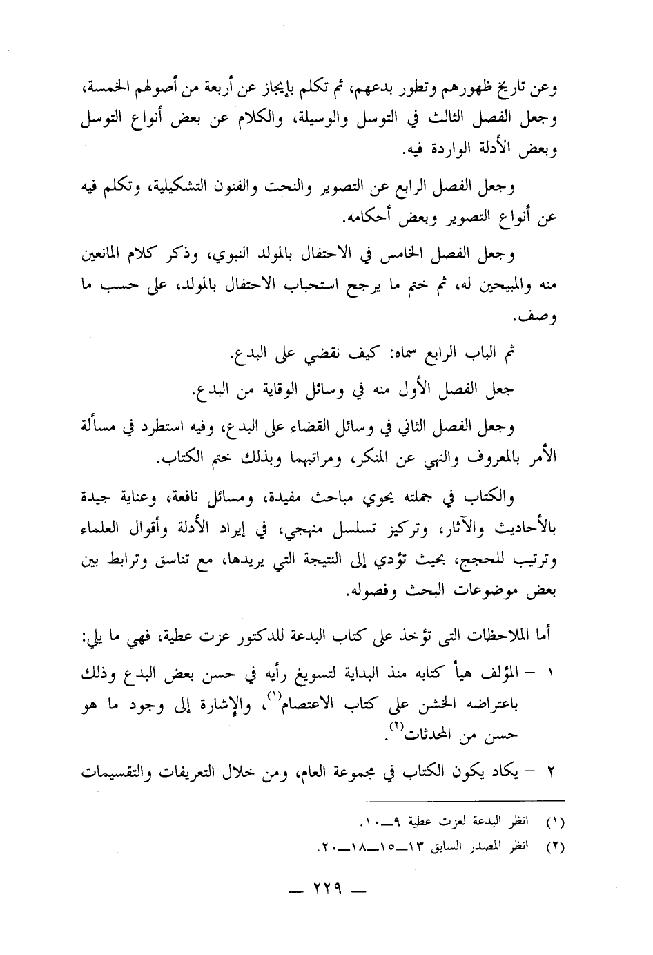1. المؤلف هيأ كتابه منذ البداية لتسويغ رأيه في حسن بعض البدع وذلك باعتراضه الخشن على كتاب الاعتصام، والإشارة إلى وجود ما هو حسن من المحدثات.
