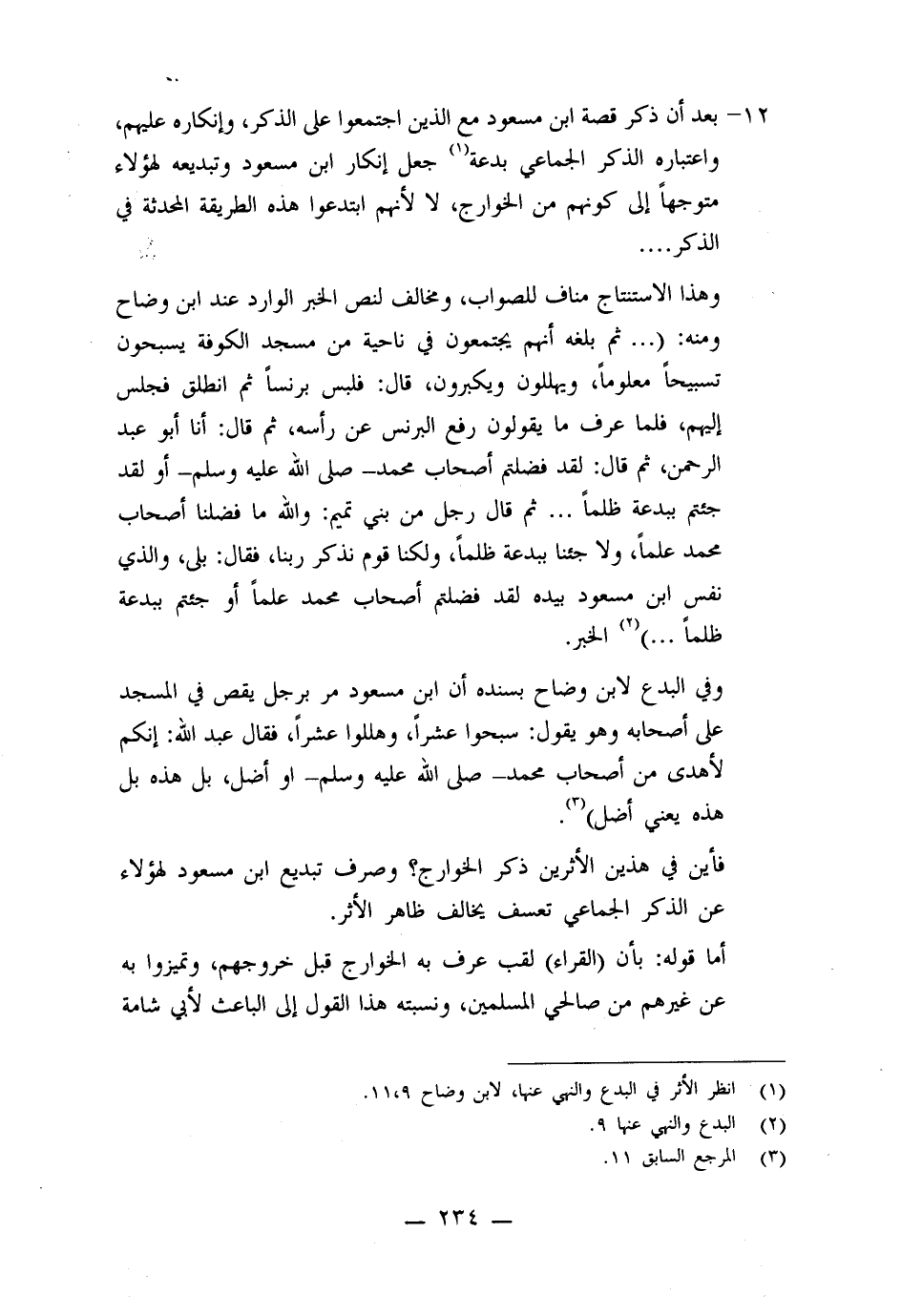 12. بعد أن ذكر قصة ابن مسعود مع الذين اجتمعوا على الذكر، وإنكاره عليهم، واعتباره الذكر الجماعي بدعة، جعل إنكار ابن مسعود وتبديعه لهؤلاء متوجها ً إلى كونهم من الخوارج، لا لأنهم ابتدعوا هذه الطريقة المحدثة في الذكر ...