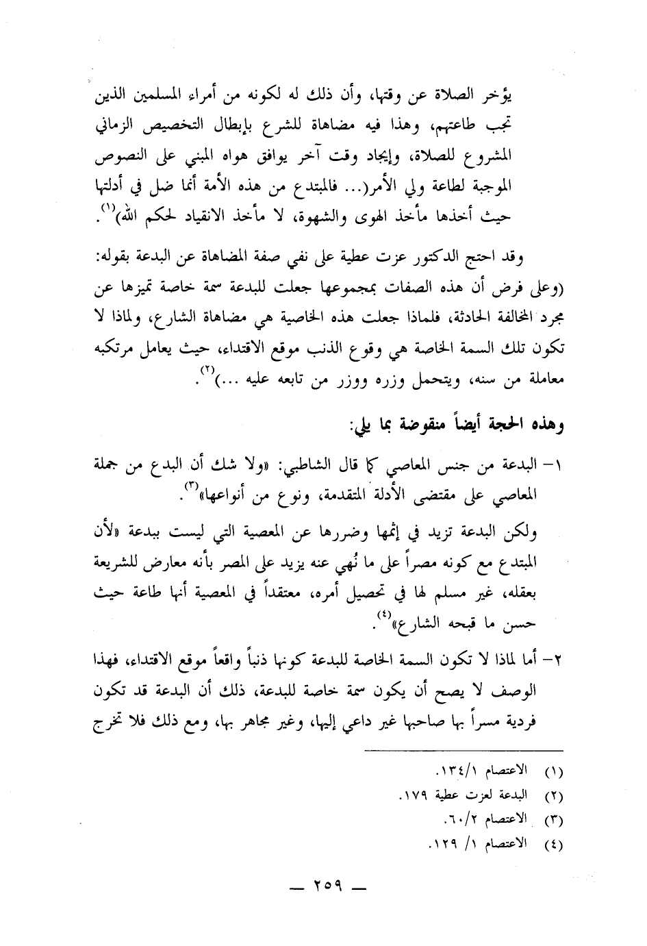 (وعلى فرض أن هذه الصفات بمجموعها جعلت للبدعة سمة خاصة تميزها عن مجرد المخالفة الحادثة، فلماذا جعلت هذه الخاصية هي مضاهاة الشارع، ولماذا لا تكون تلك السمة الخاصة هي وقوع الذنب موقع الاقتداء، حيث يعامل مرتكبه معاملة من سنه، ويتحمل وزره ووزر من تابعه عليه ... ) .