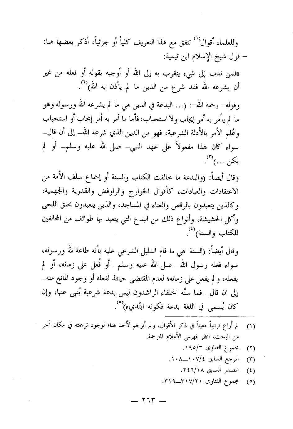 وقال أيضا ً: ( ... والبدعة ما خالفت الكتاب والسنة أو إجماع سلف الأمة من الاعتقادات والعبادات، كأقوال الخوارج والروافض والقدرية والجهمية، وكالذين يتعبدون بالرقص والغناء في المساجد، والذين يعتبدون بحلق اللحى وأكل الحشيشة، وأنواع ذلك من البدع التي يتعبد بها طوائف من المخالفين للكتاب والسنة) .