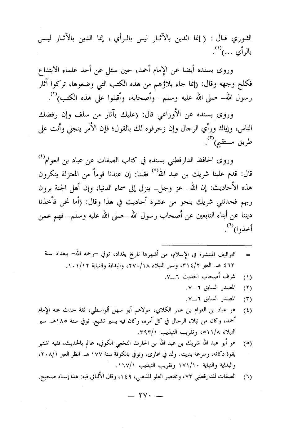 وروى الحافظ الدارقطني بسنده في كتاب الصفات عن عباد بن العوام قال: قدم علينا شريك بن عبد الله فقلنا: إن عندنا قوماً من المعتزلة ينكرون هذه الأحاديث: إن الله - عز وجل - ينزل إلى سماء الدنيا، وإن أهل الجنة يرون ربهم فحدثني شريك بنحو من عشرة أحاديث في هذا وقال: (أما نحن فأخذنا ديننا عن أبناء التابعين عن أصحاب رسول الله - صلى الله عليه وسلم - فهم عمن أخذوا) .